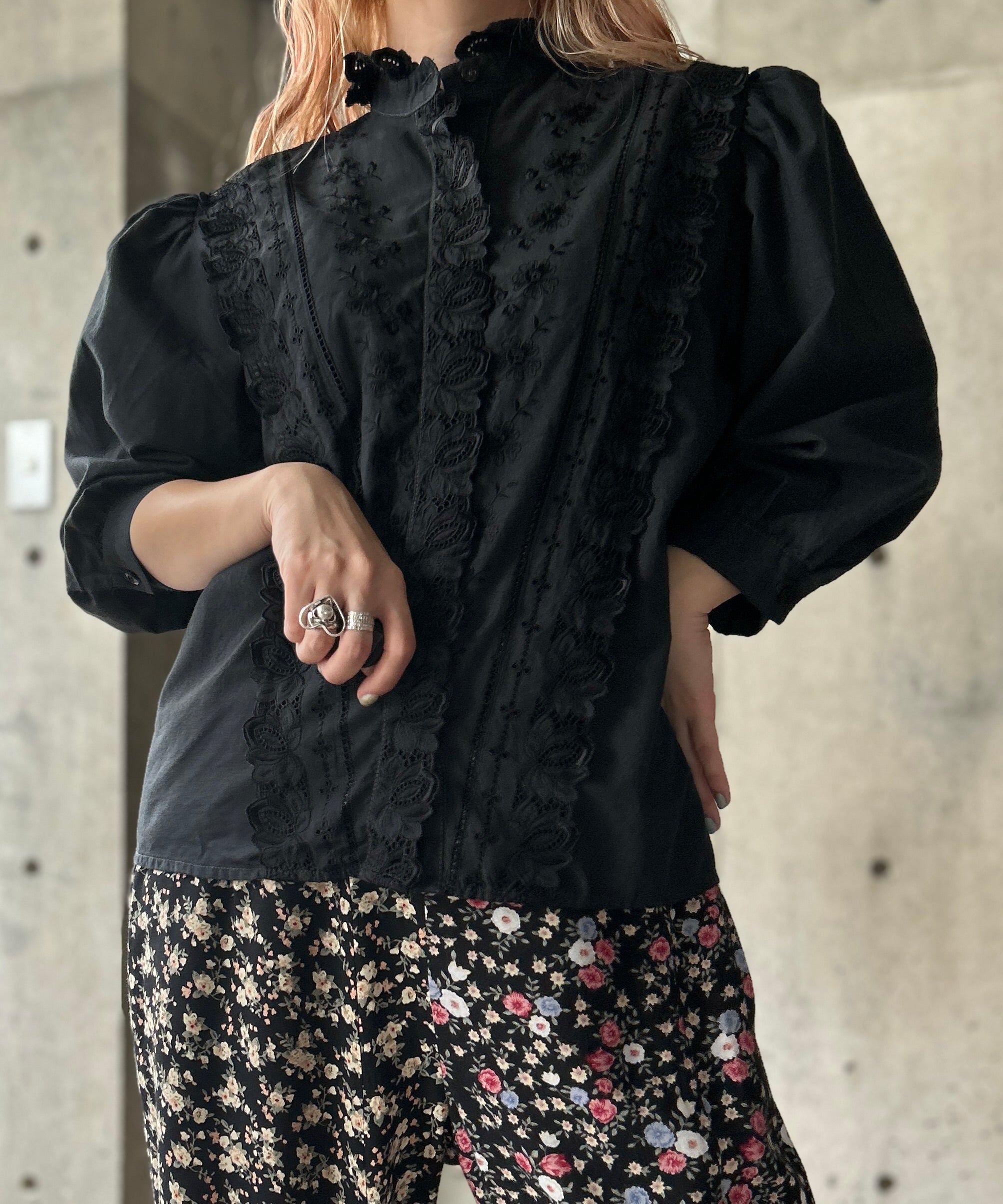 スタンドカラーの長袖ブラウス。