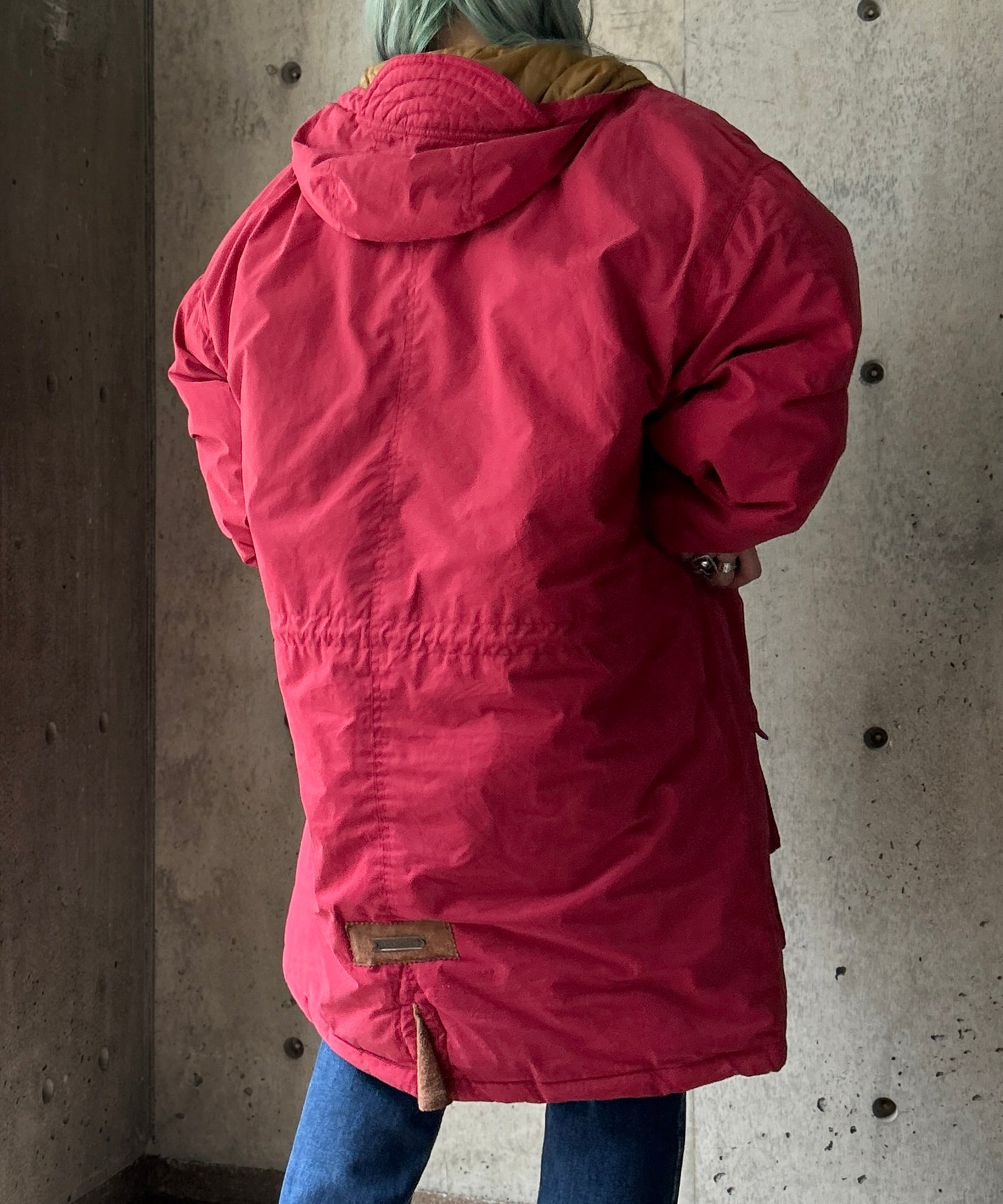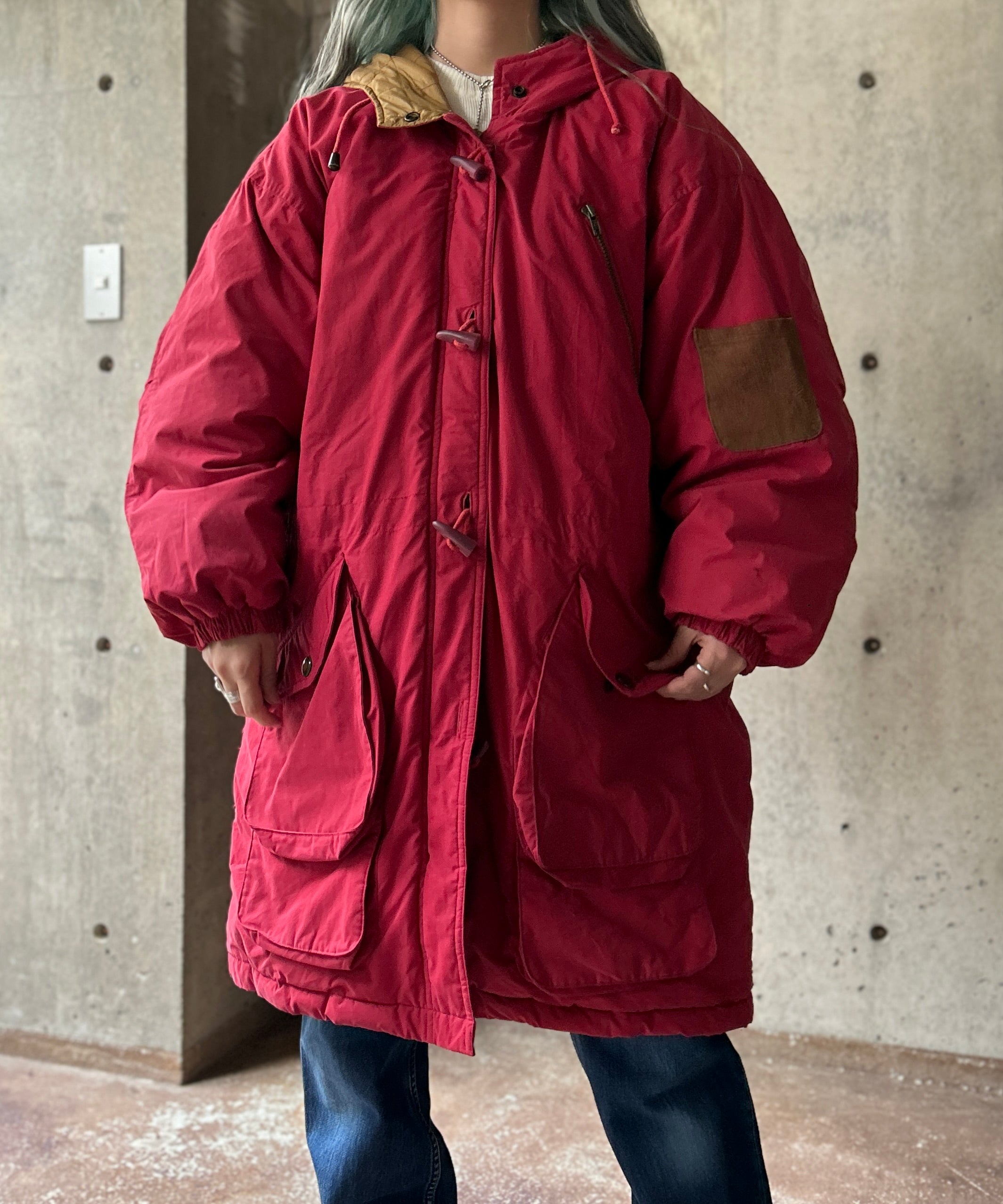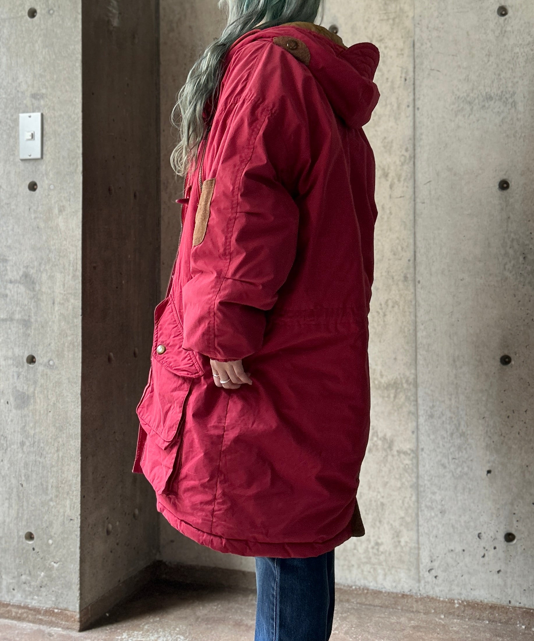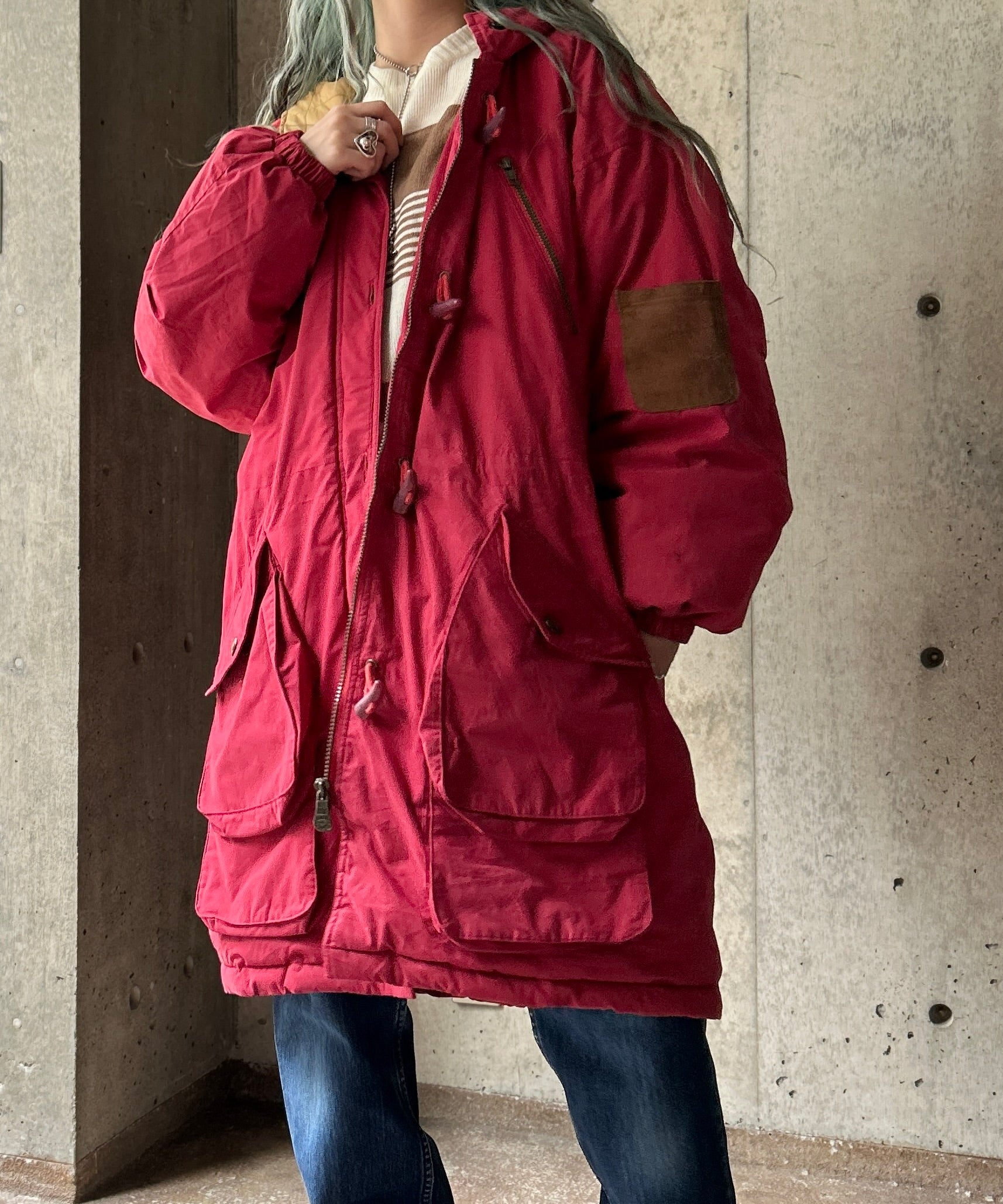 くすんだ赤が珍しいロングダウンコート。