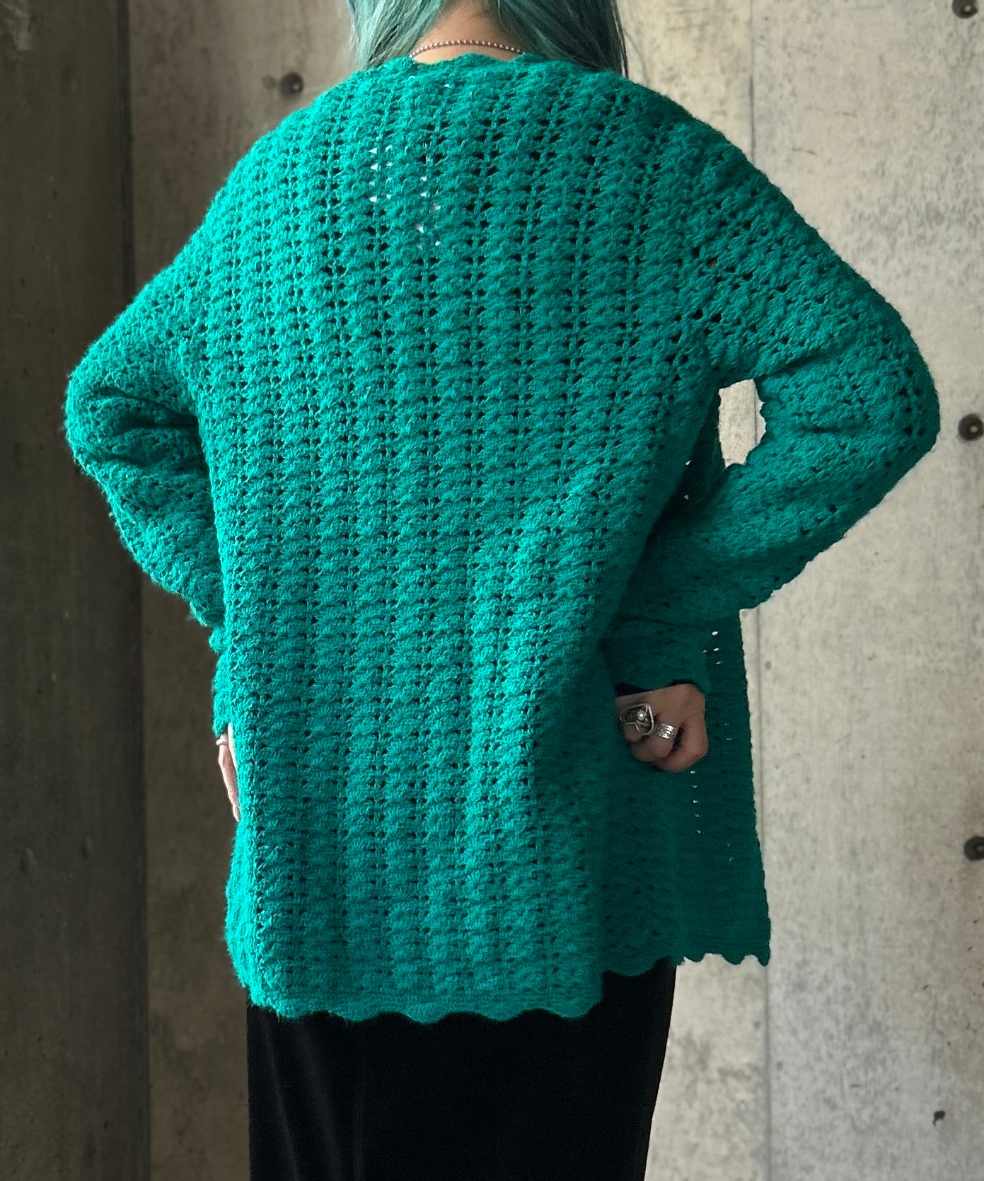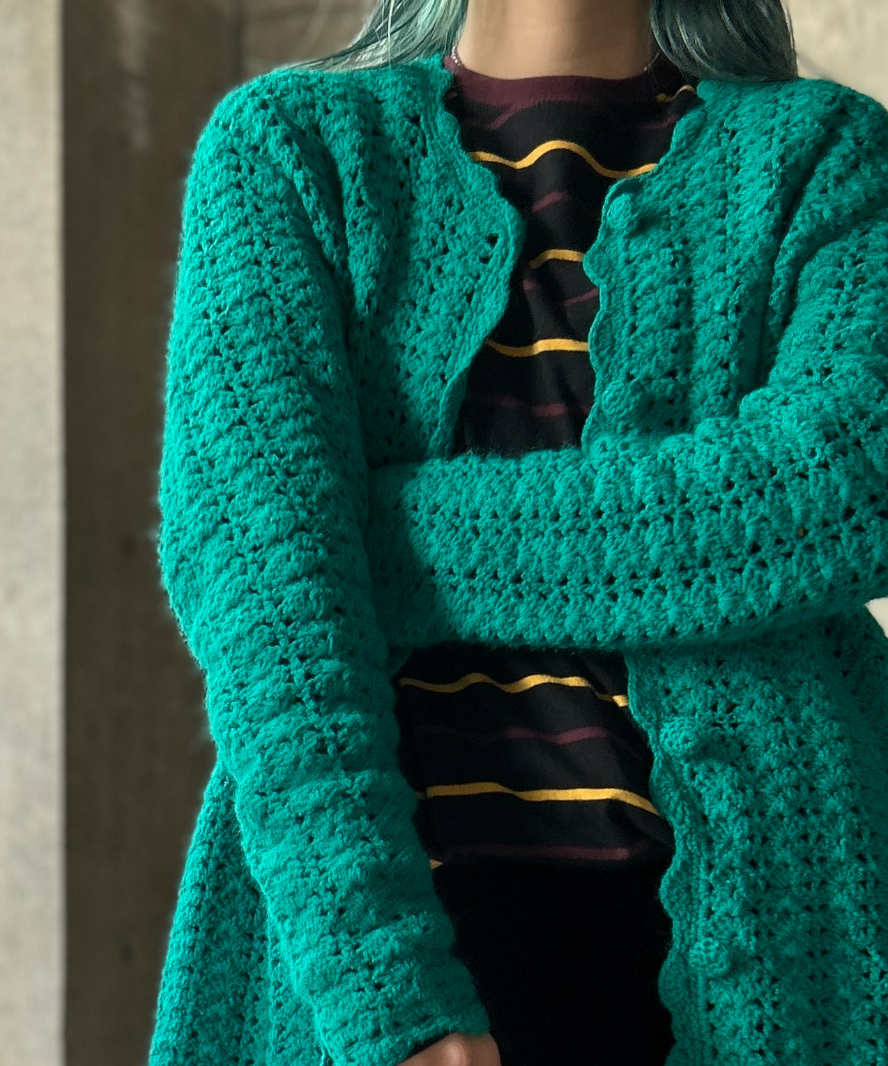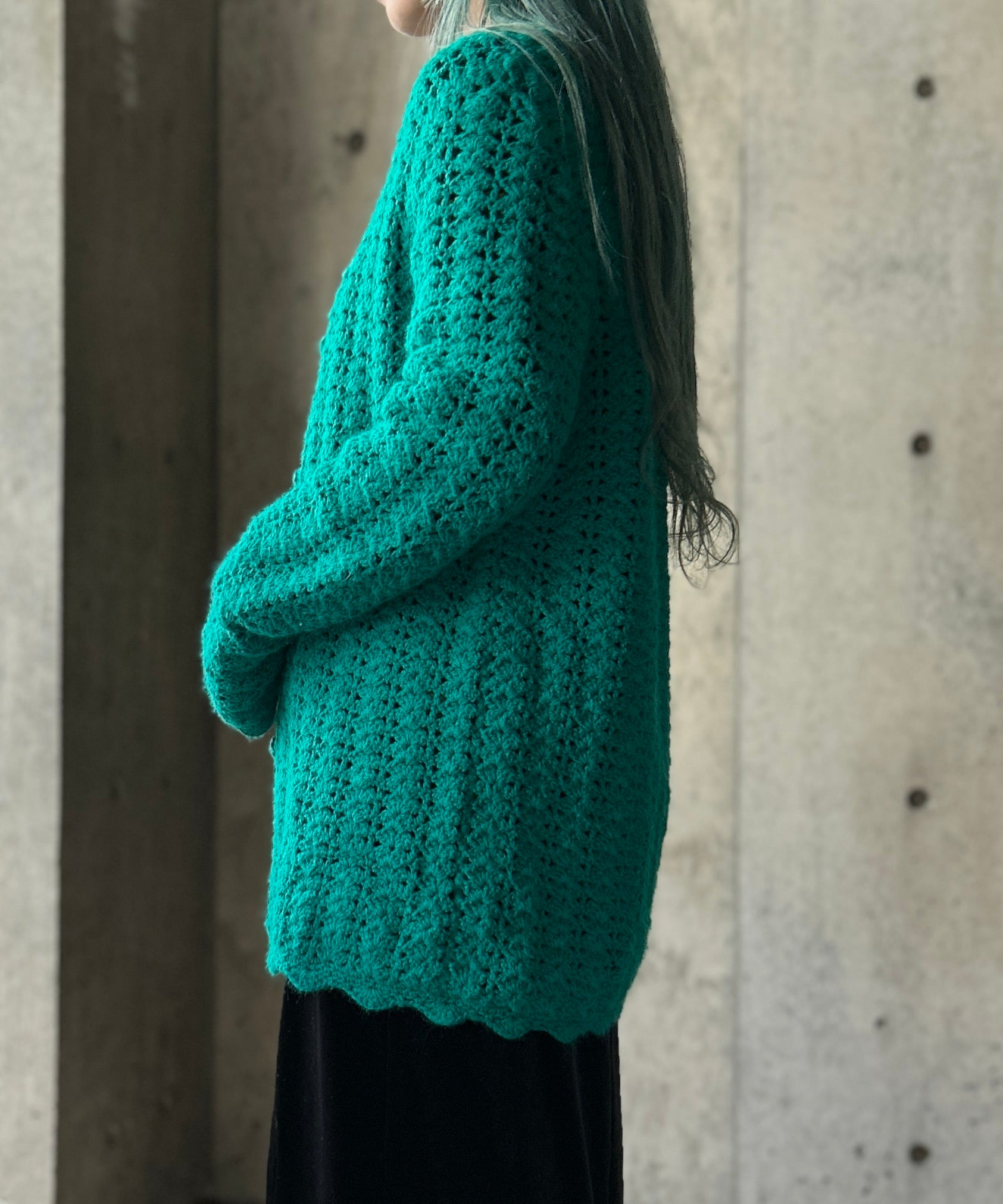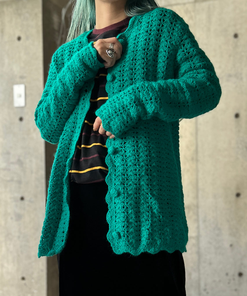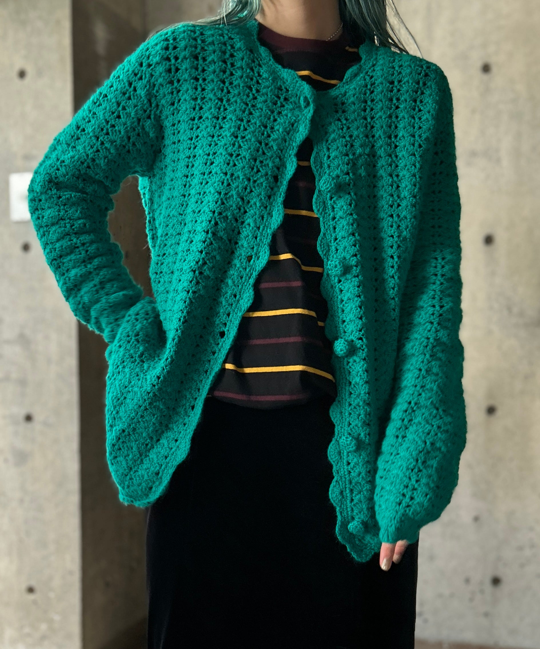 クロシェ編みでボタンまでくるみボタンなのも凝っていてgood。