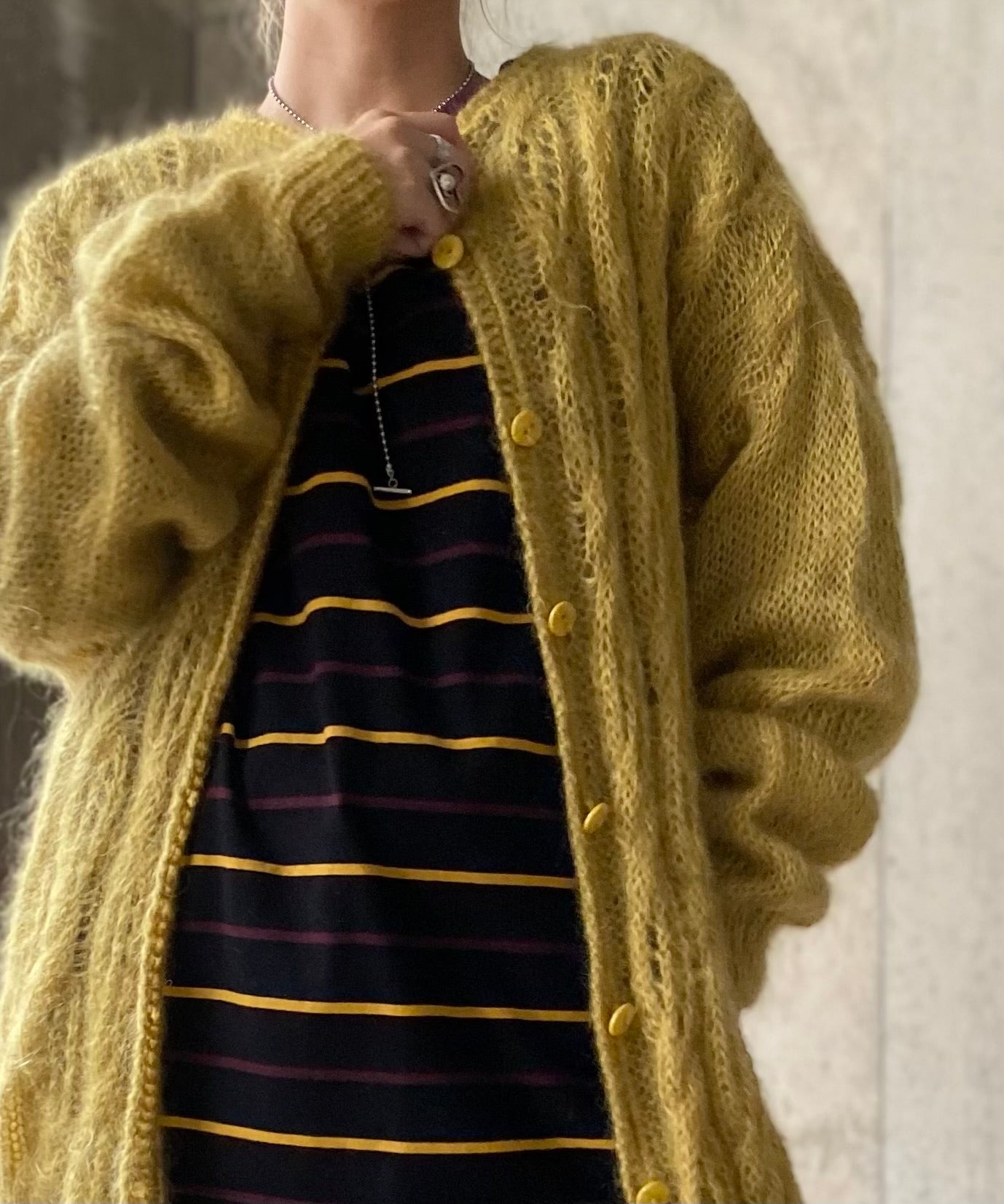 カラシ色のニットカーディガン。