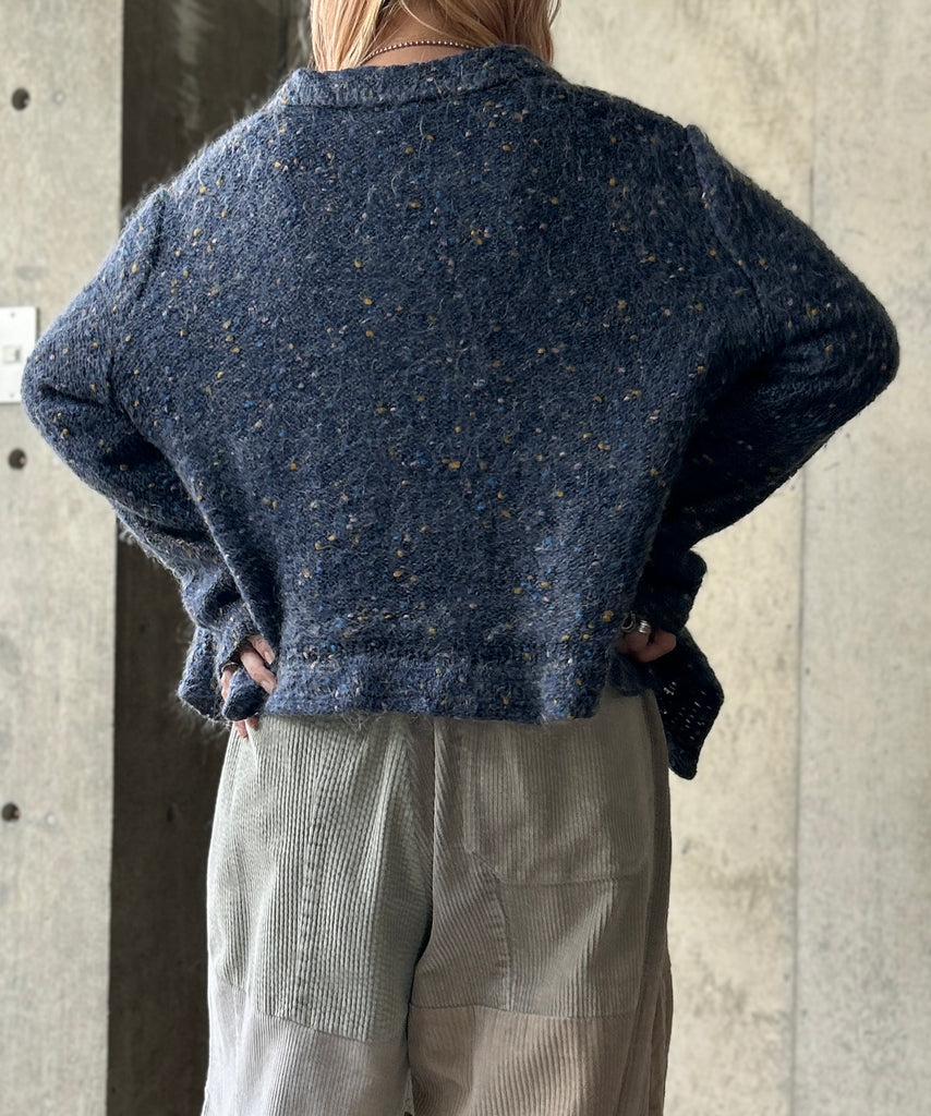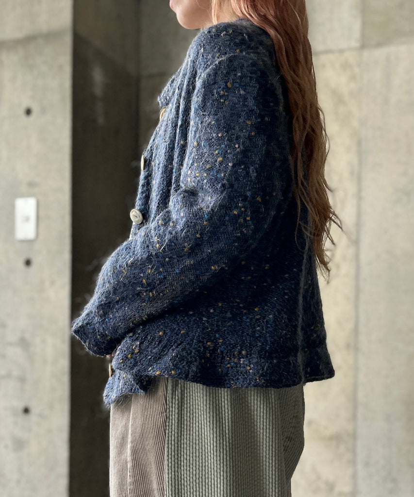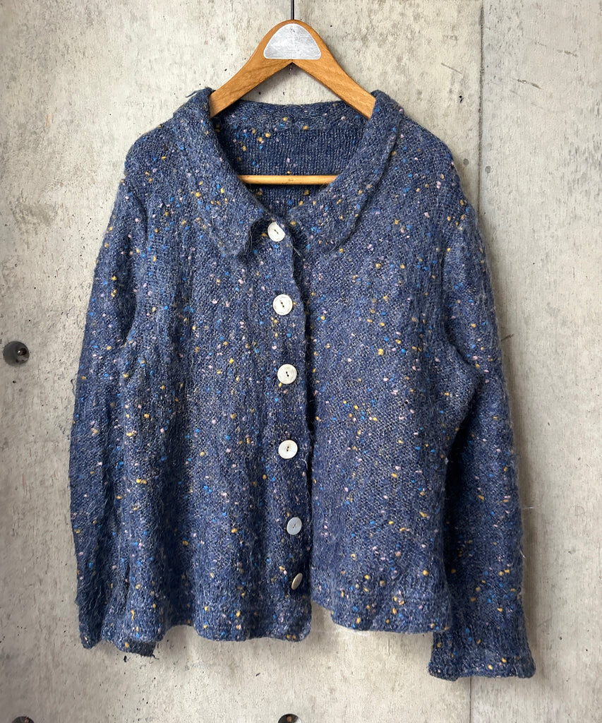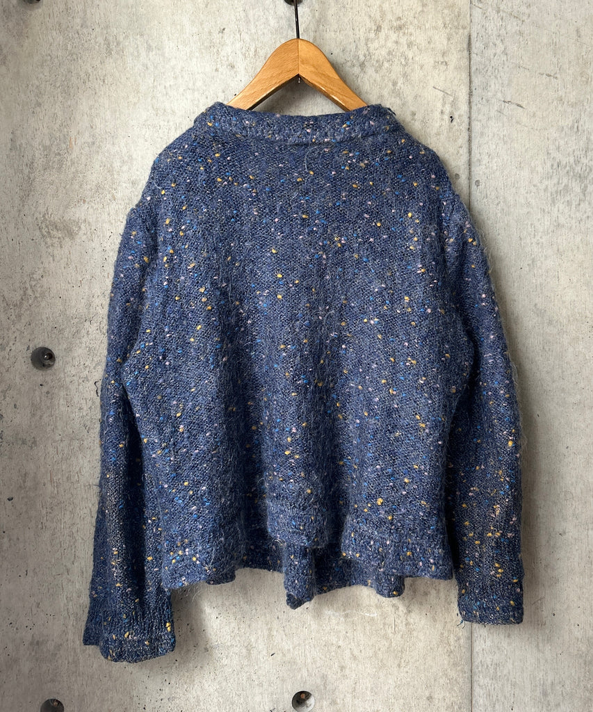 襟付きのミックスカラーのモヘアニットカーディガン。