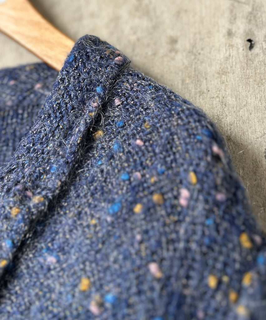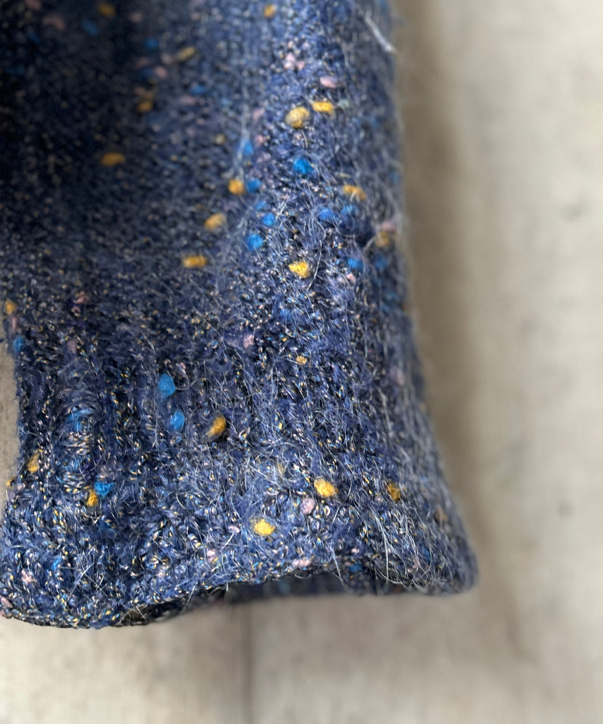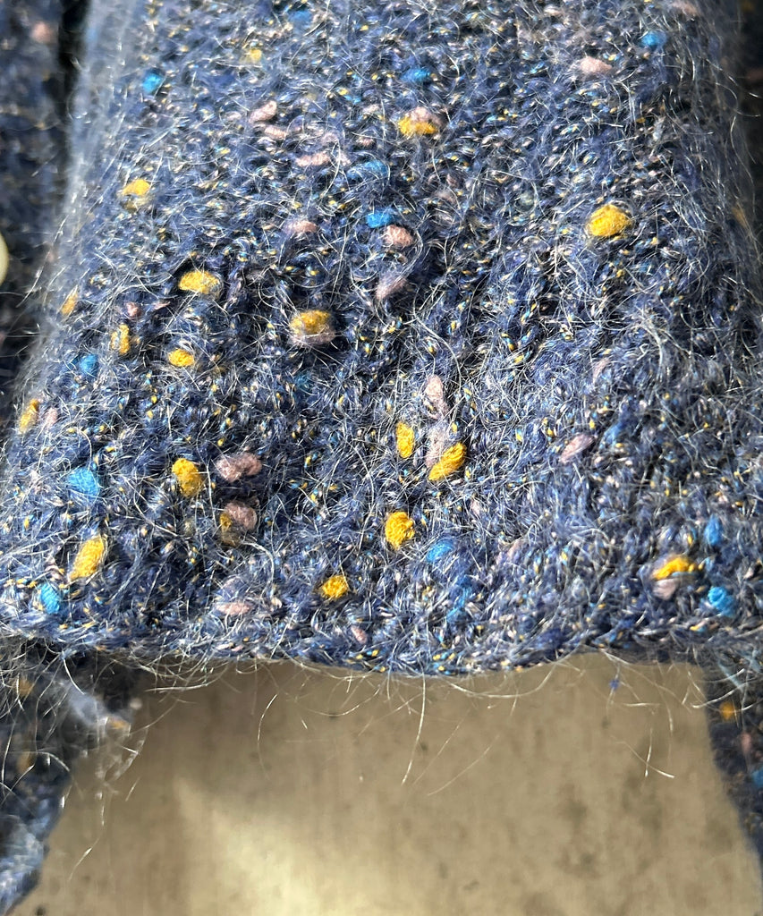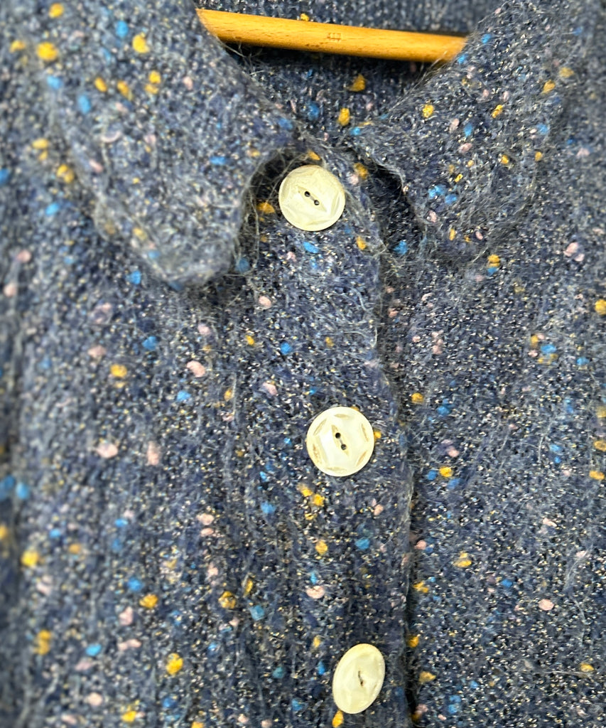 襟付きのミックスカラーのモヘアニットカーディガン。