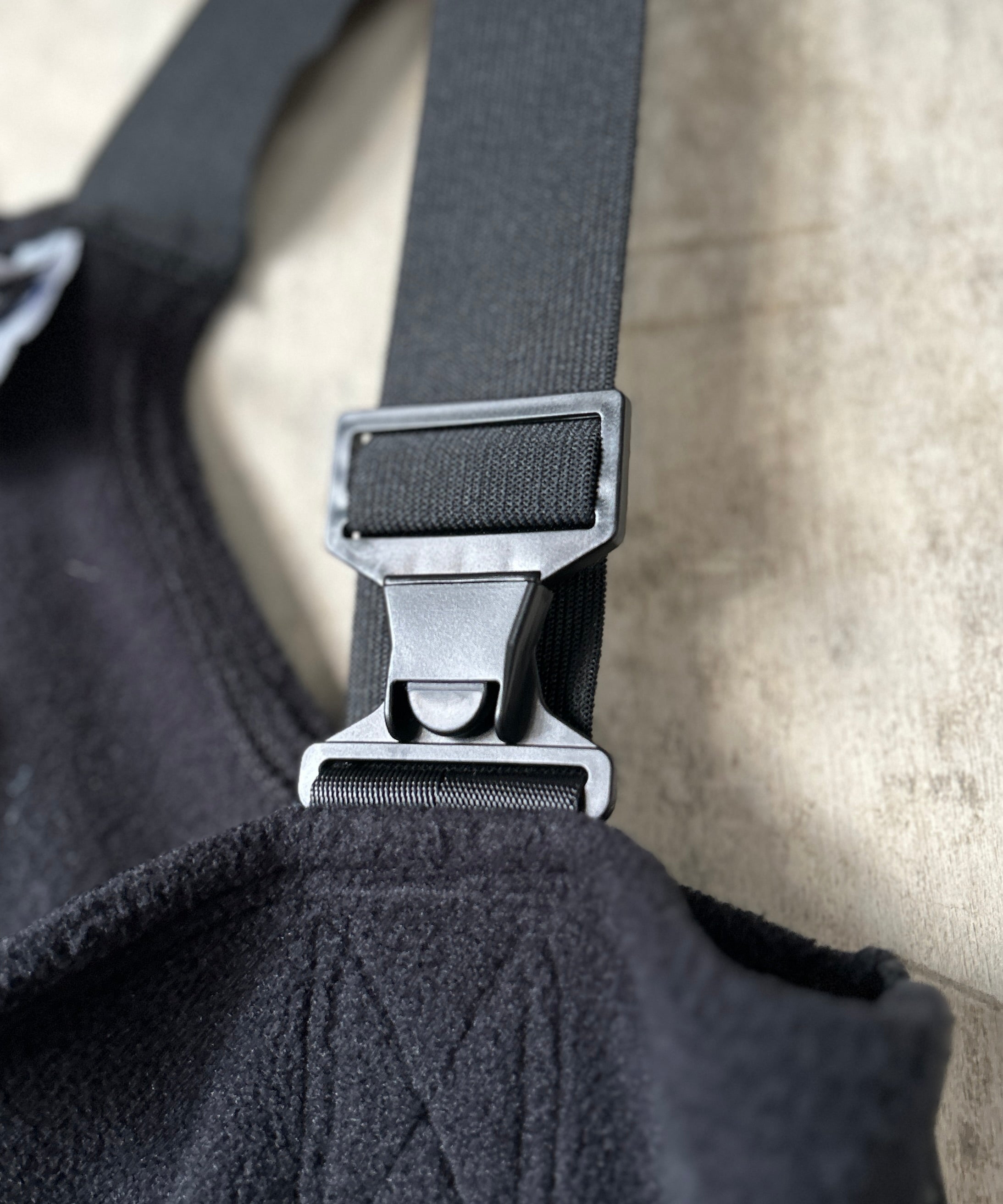 フロント、サイドにダブルジップ、調節可能なエラスティックサスペンダーが付きます。