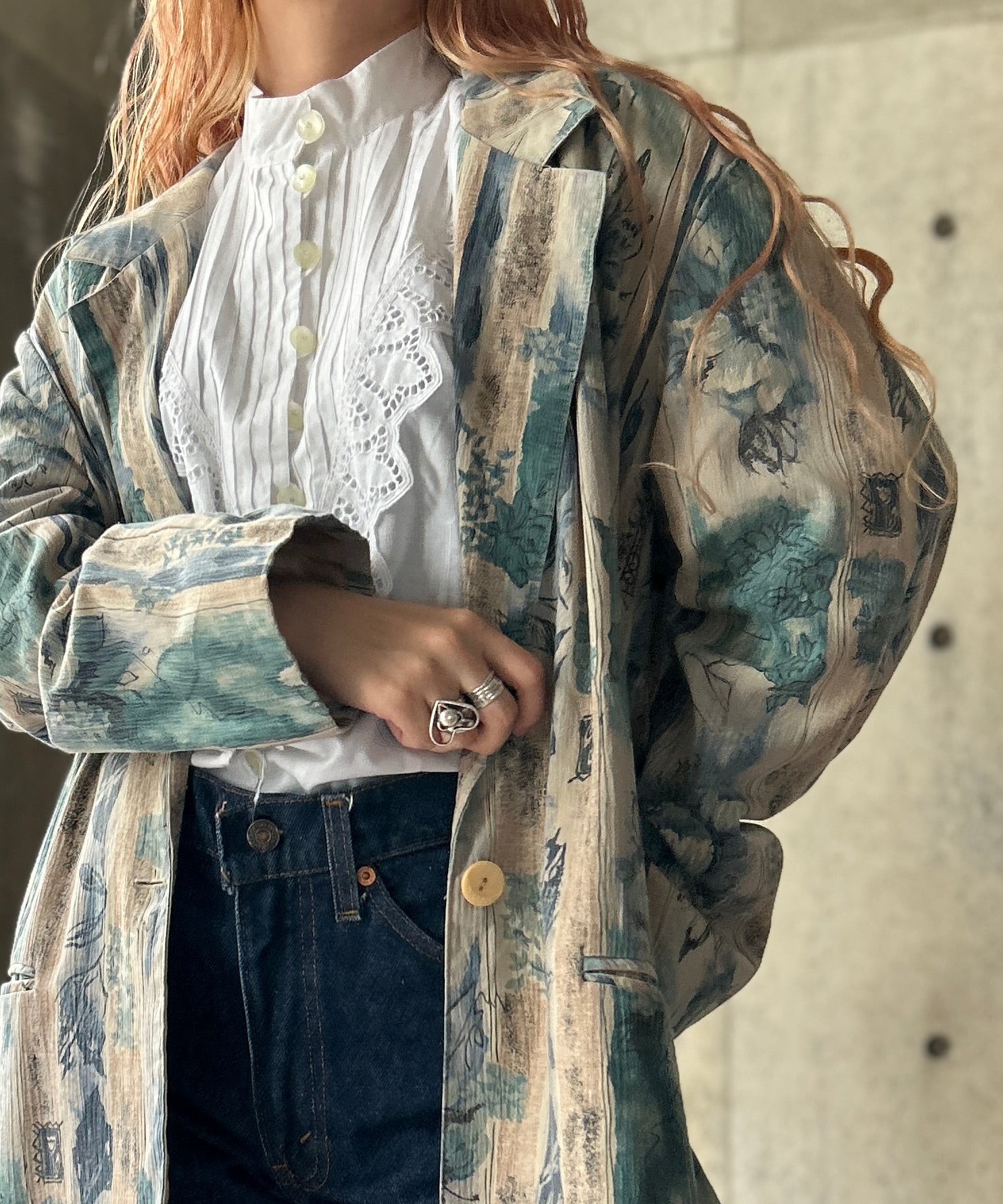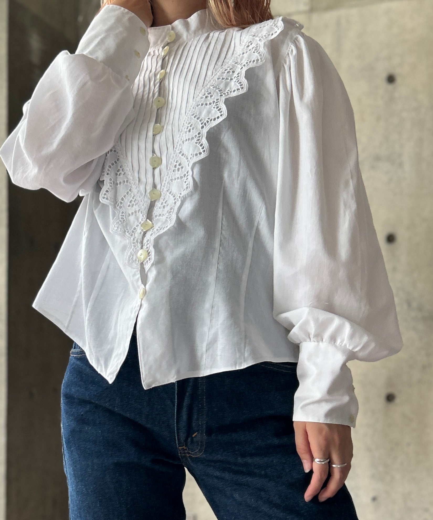 スタンドカラーの長袖レースシャツ。