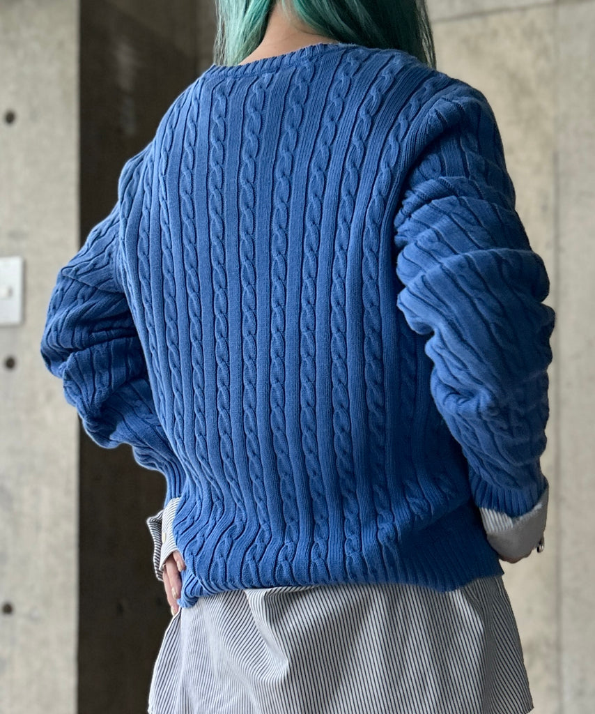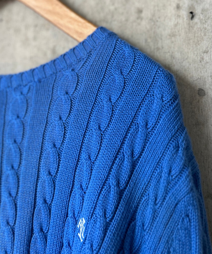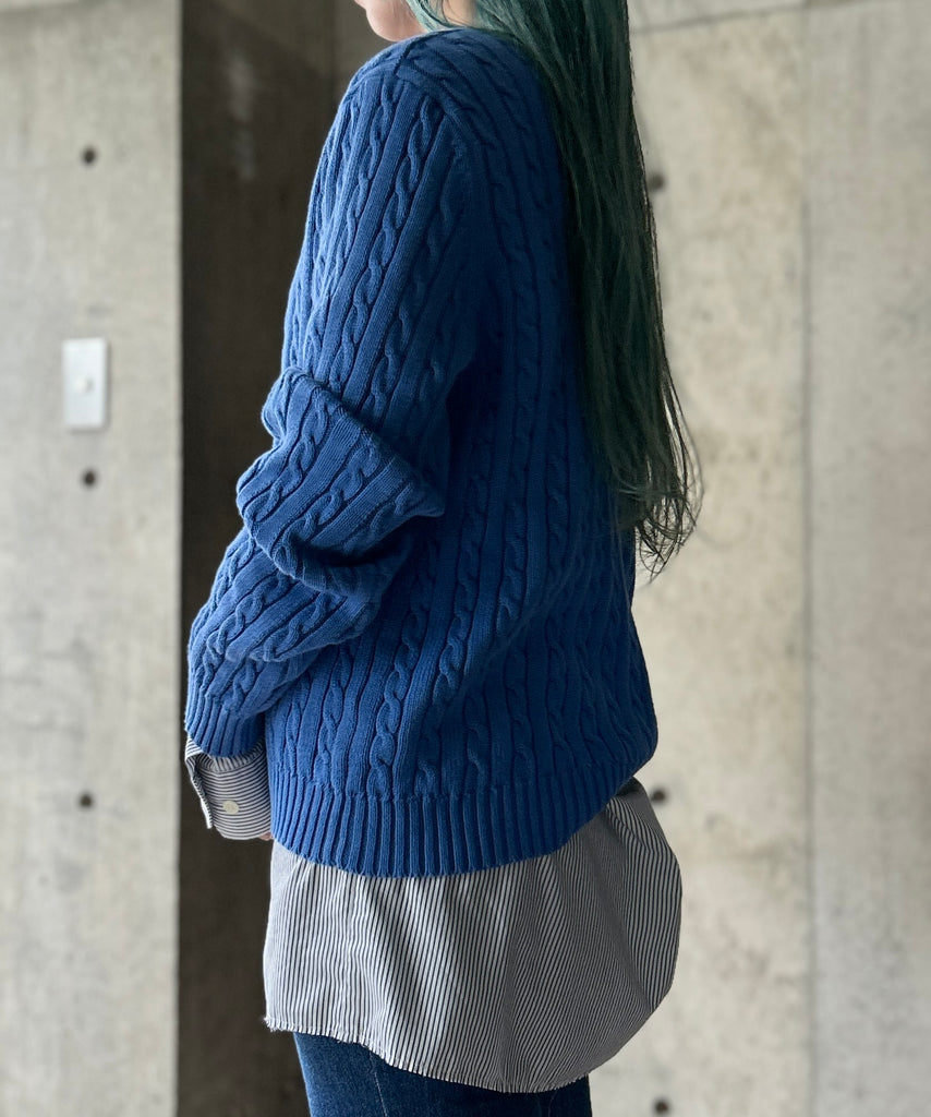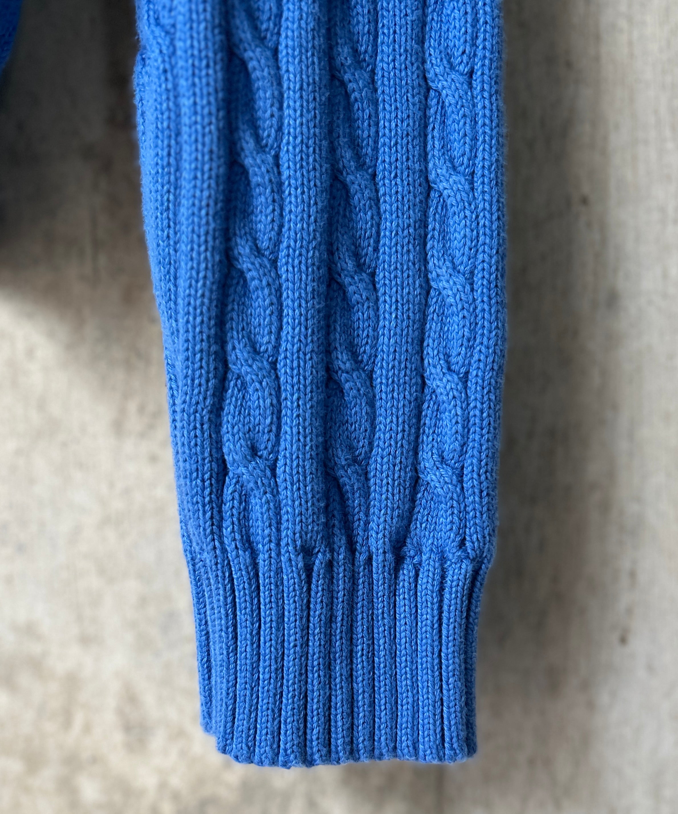 細めのケーブル編み、胸元のワンポイント刺繍がシンプルすぎないgoodデザイン。