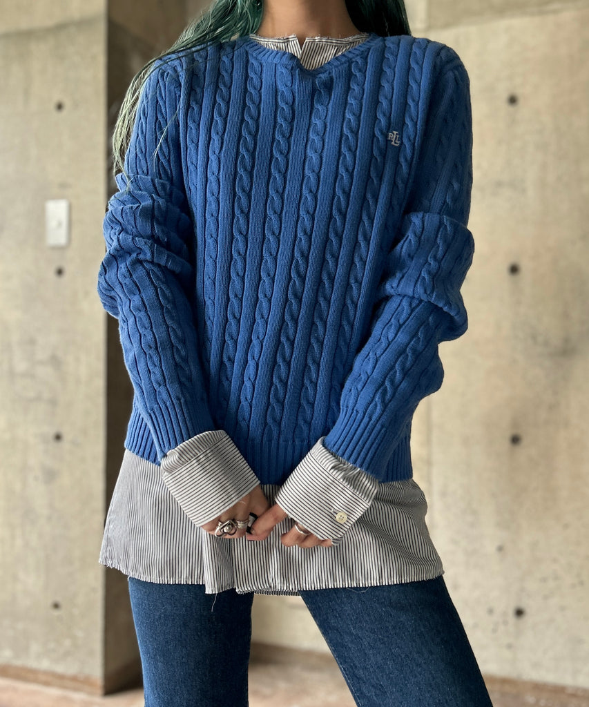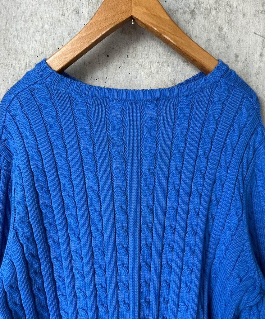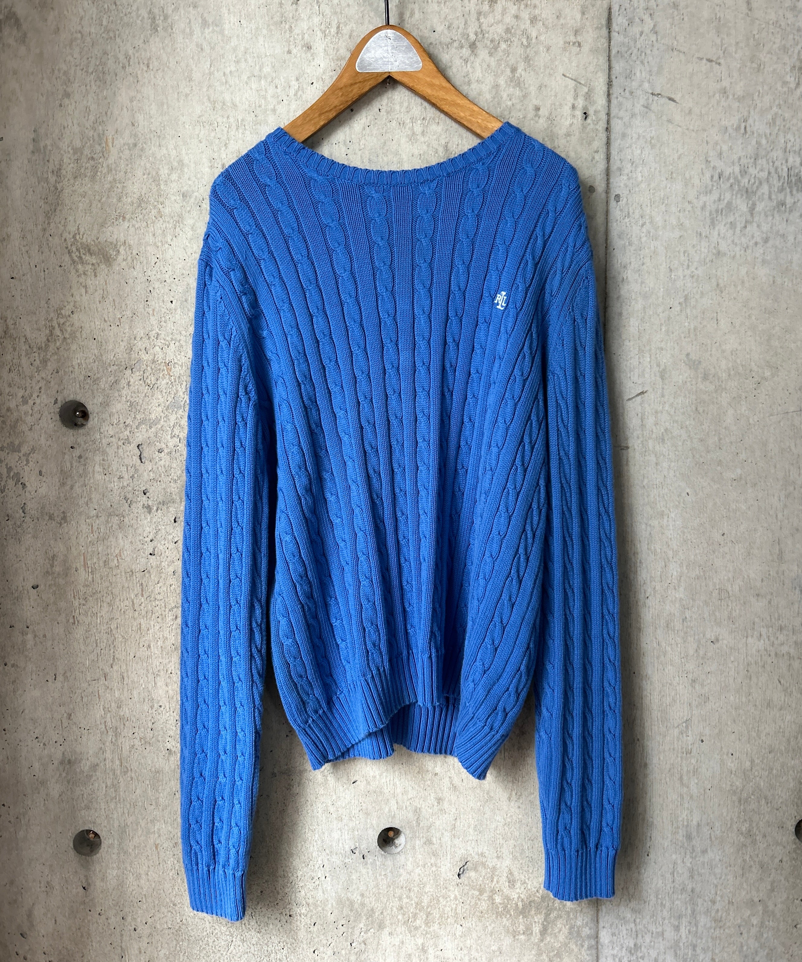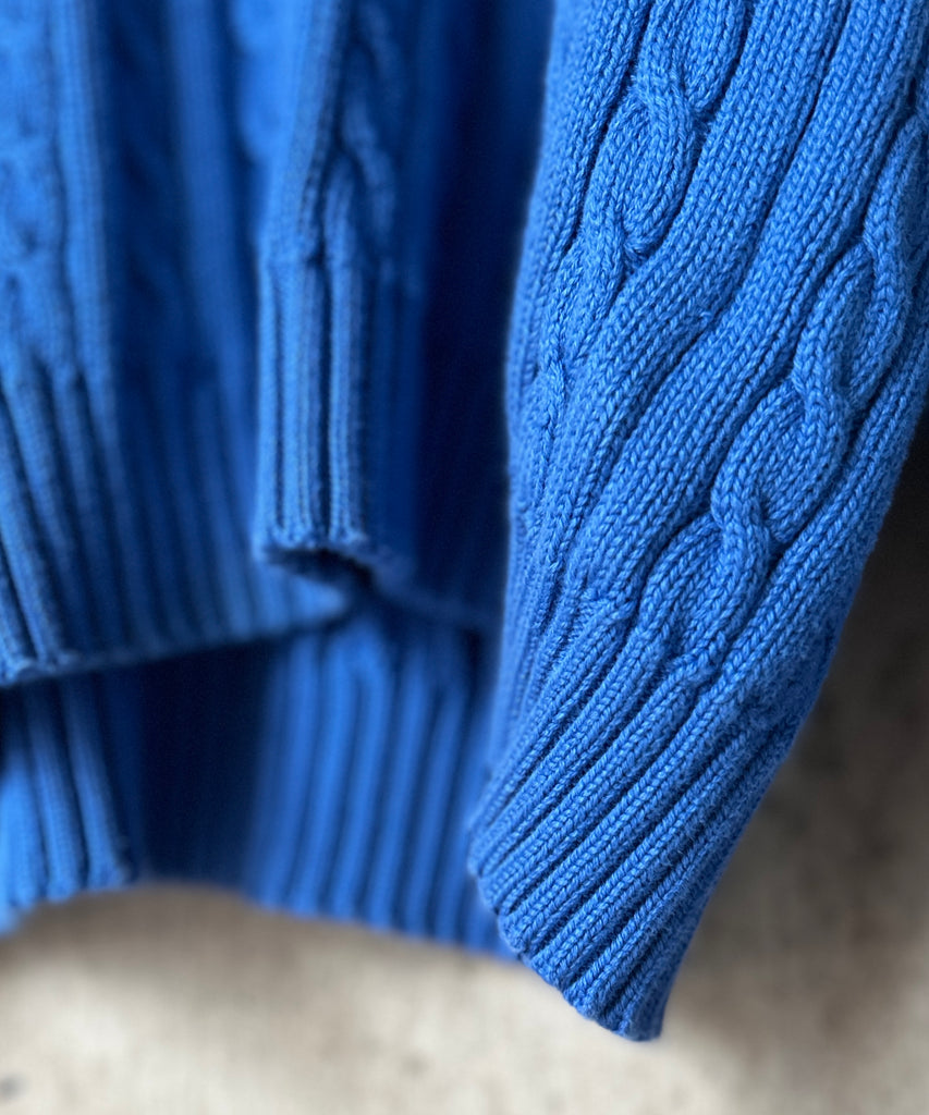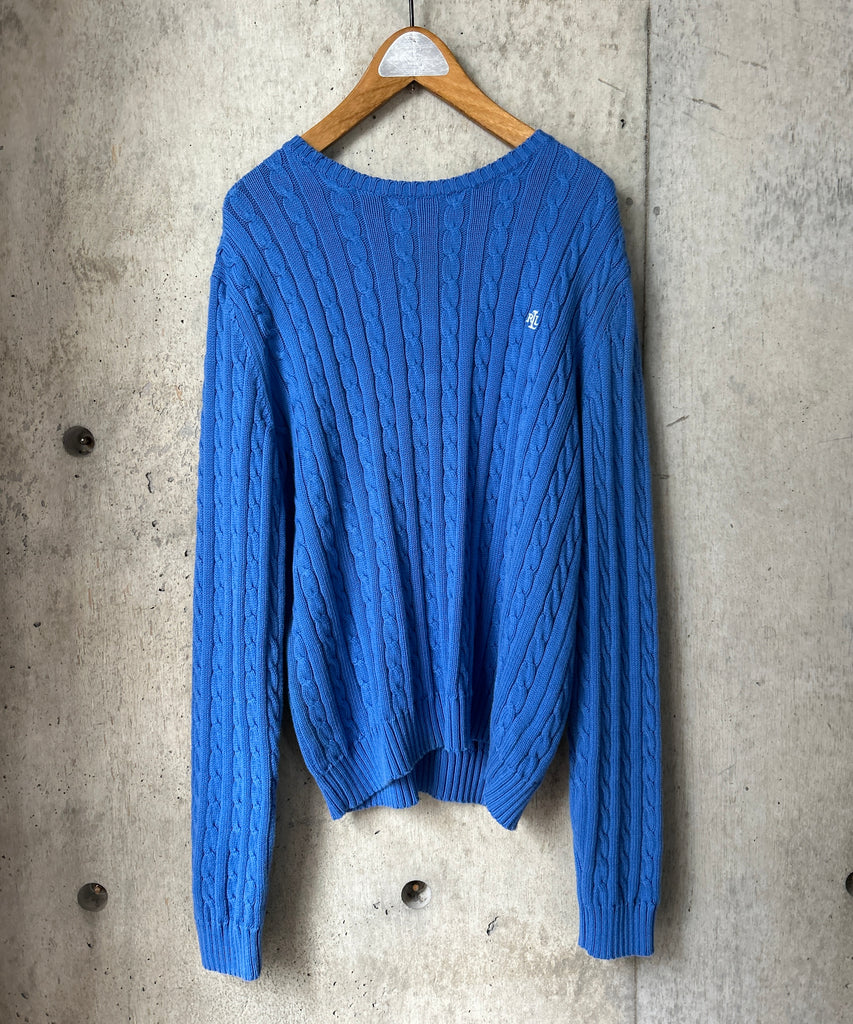 細めのケーブル編み、胸元のワンポイント刺繍がシンプルすぎないgoodデザイン。