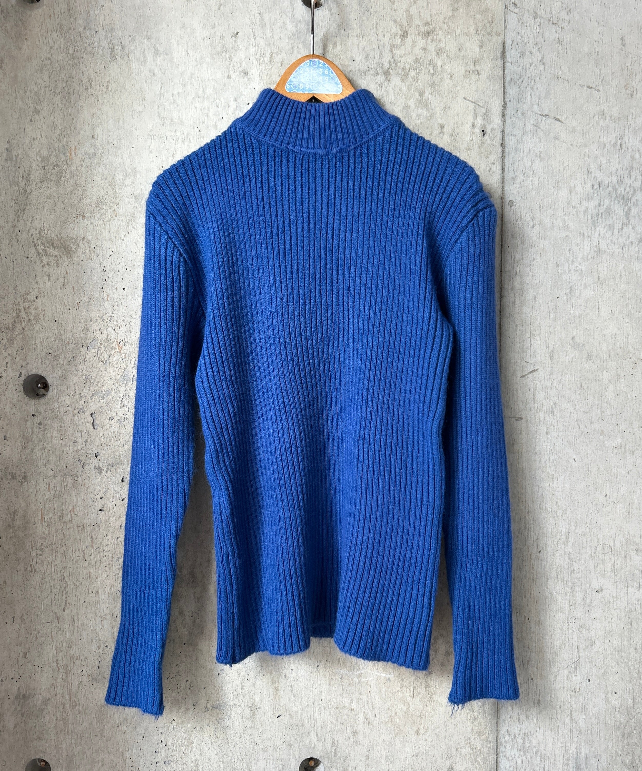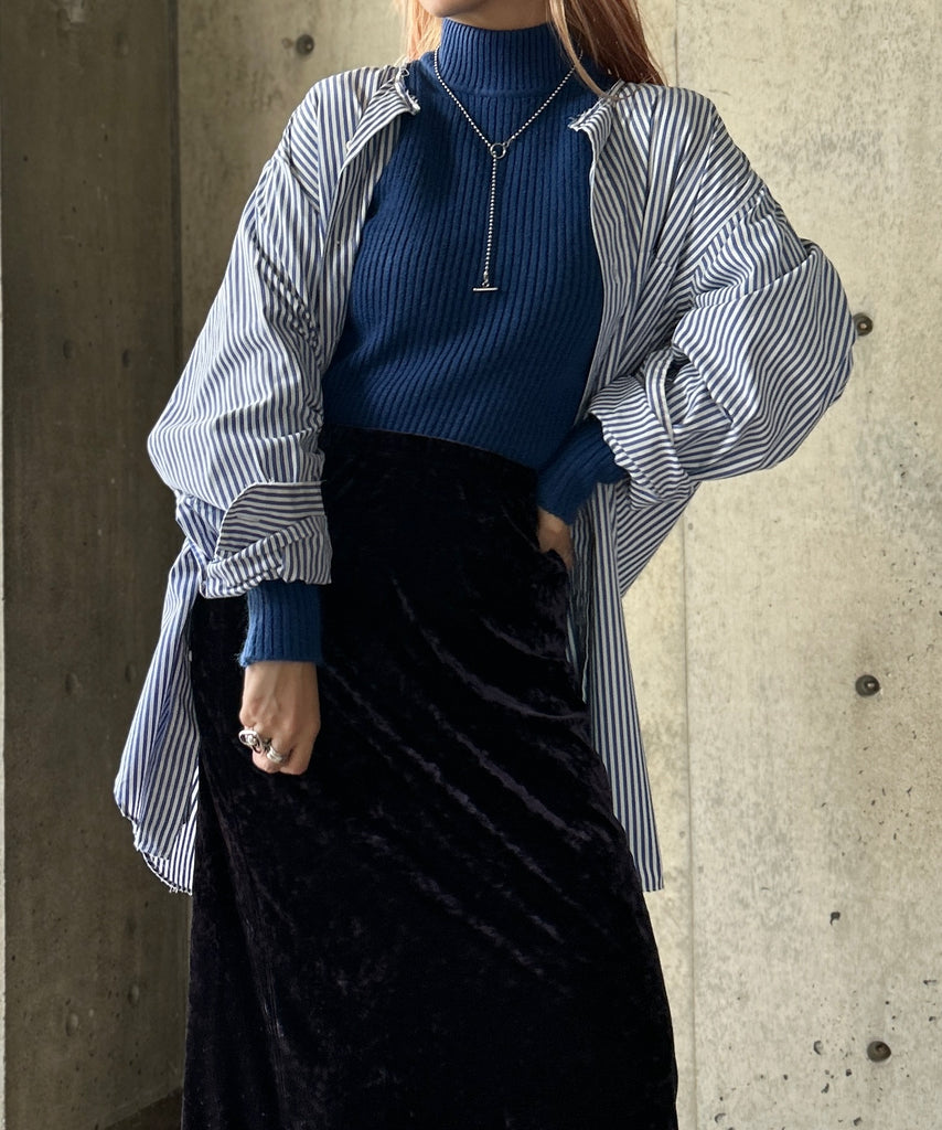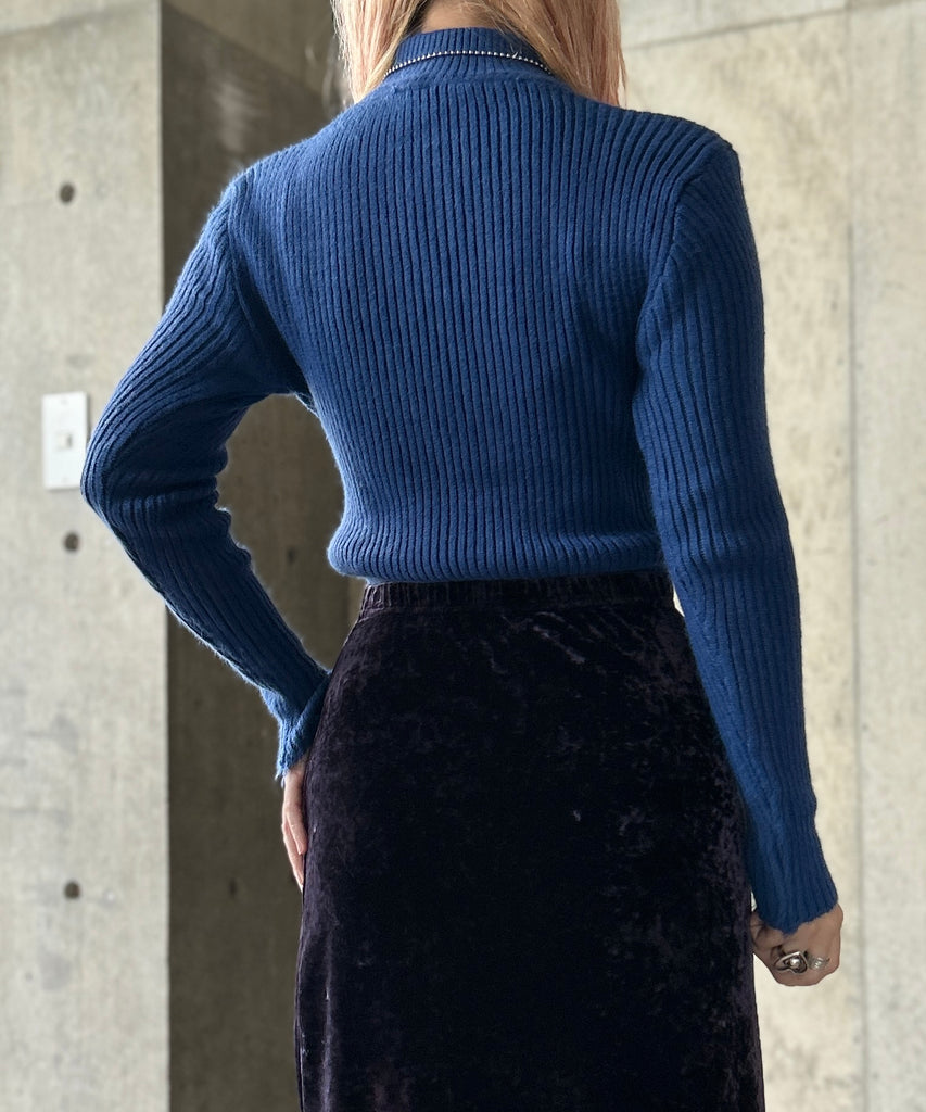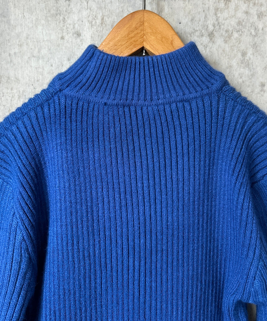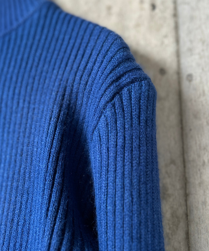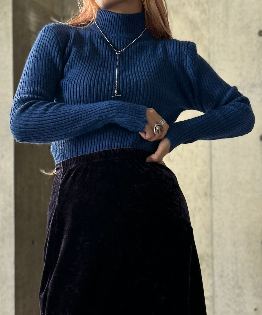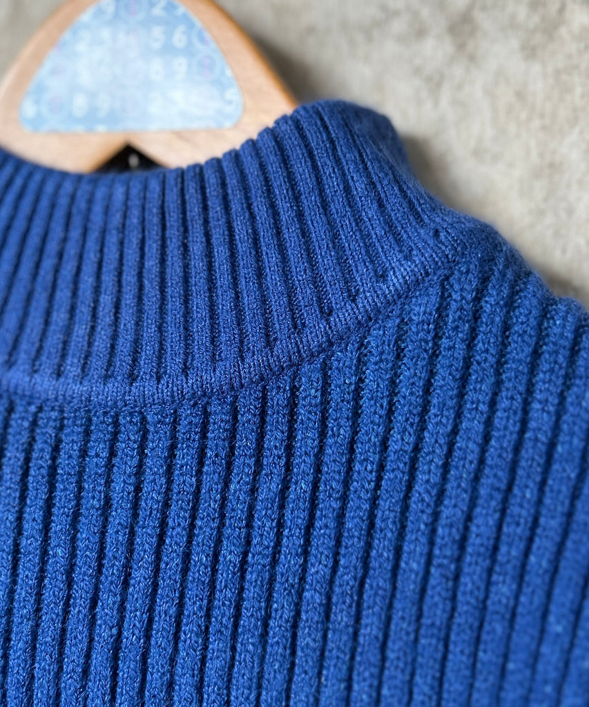 落ち着いたブルーカラー、首の高すぎないモックネックが着やすいです◎