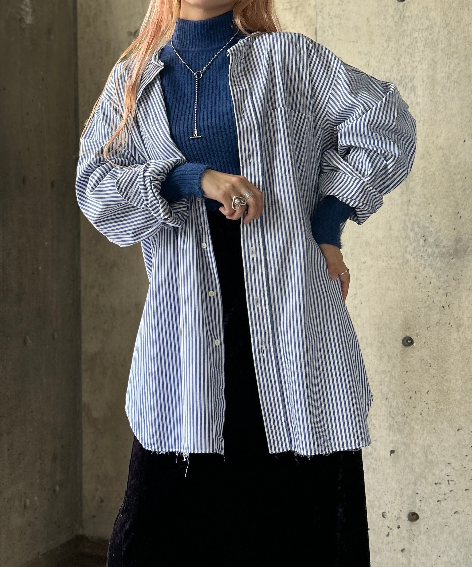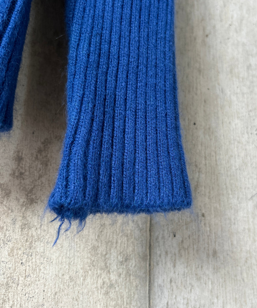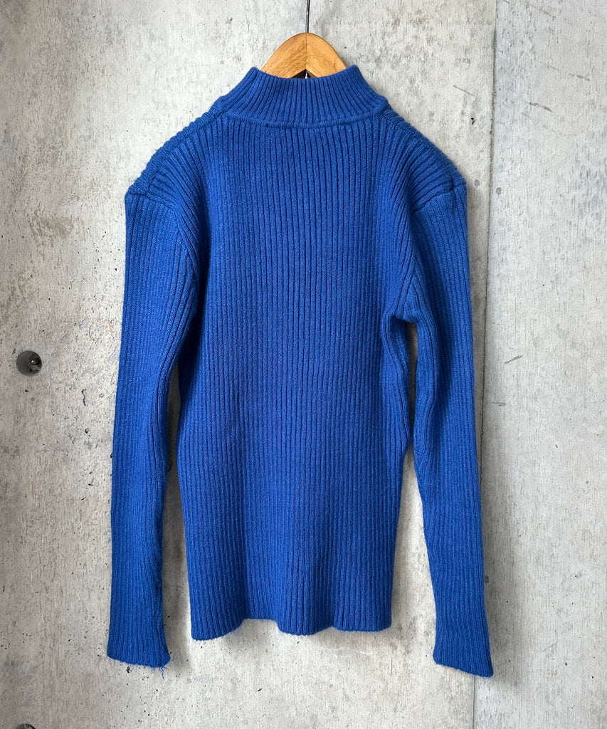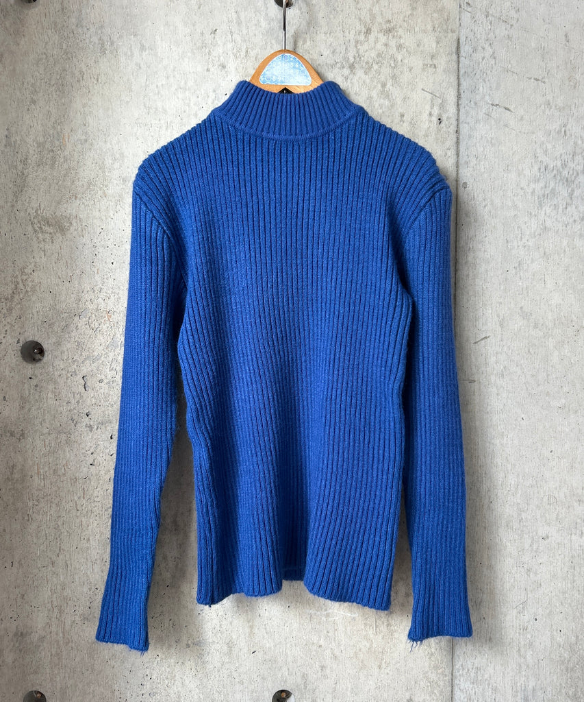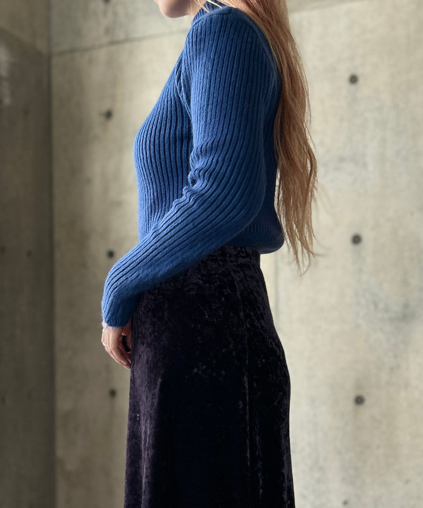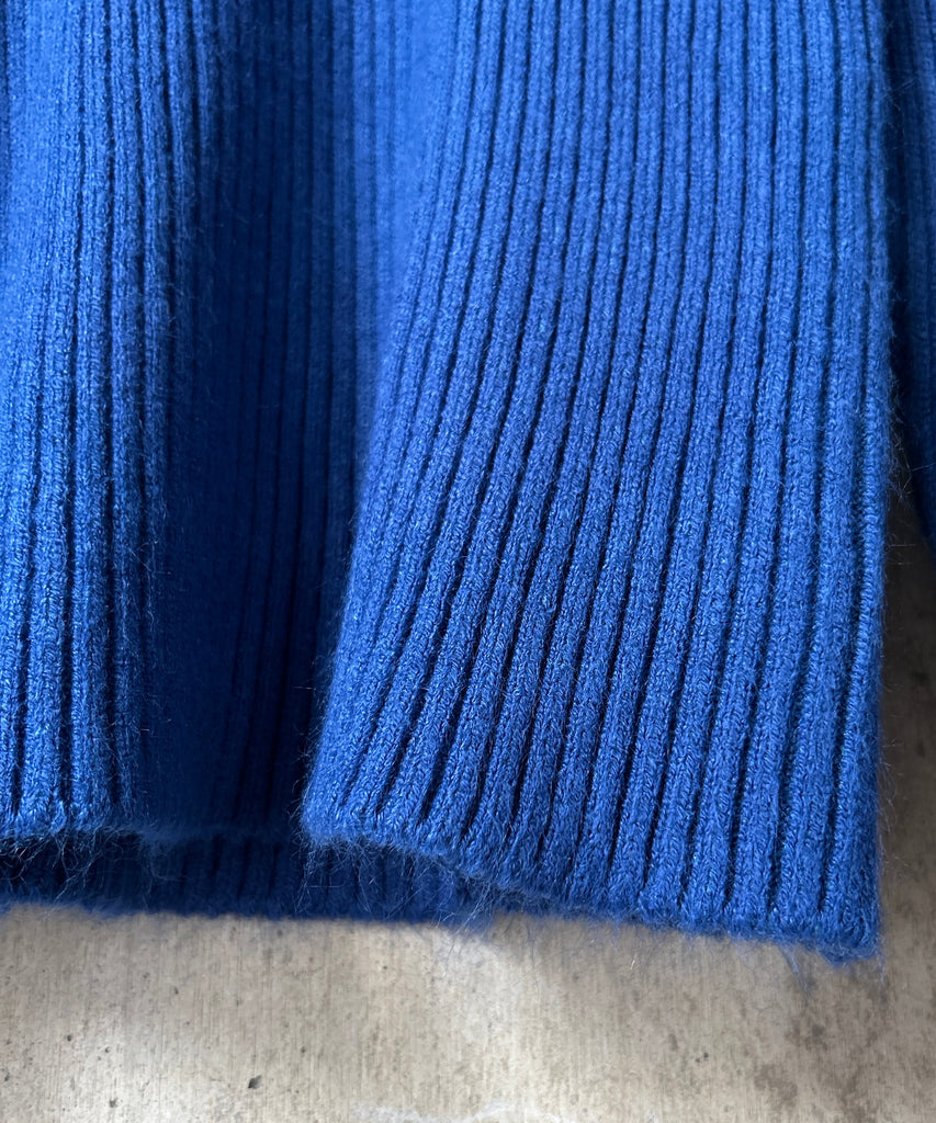 落ち着いたブルーカラー、首の高すぎないモックネックが着やすいです◎