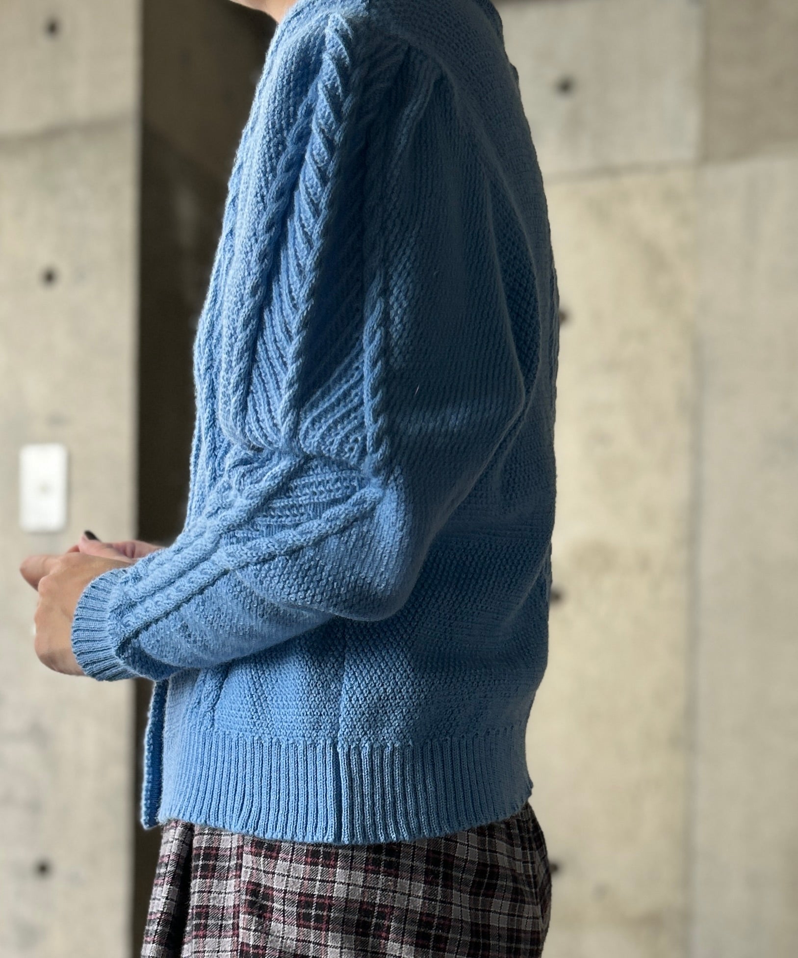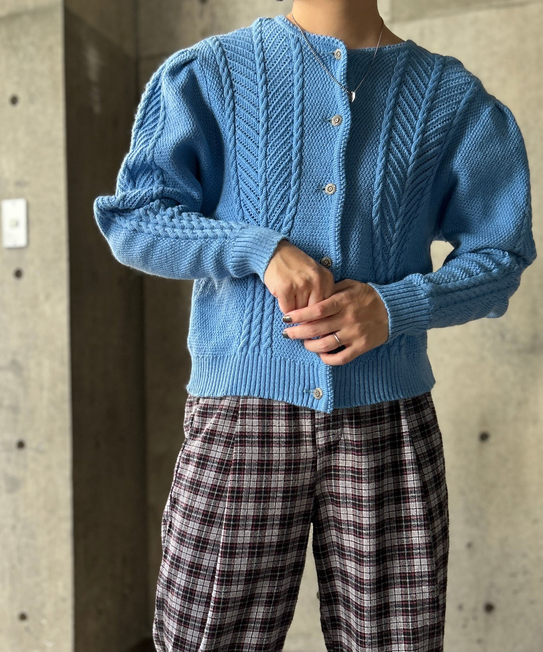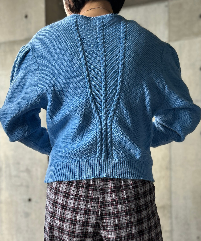 きれいなブルーカラーのニットカーディガン。