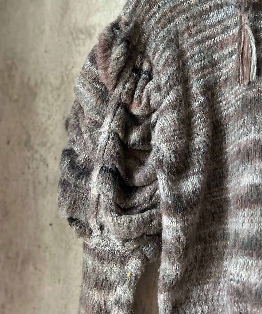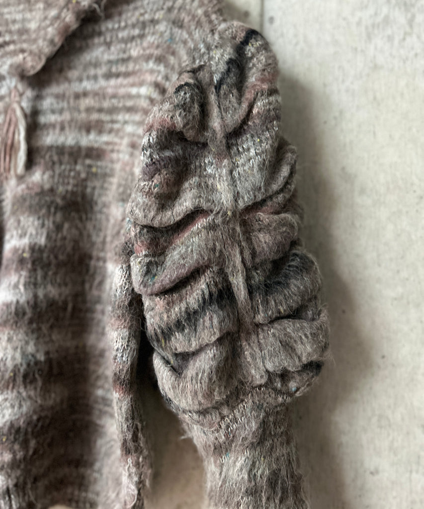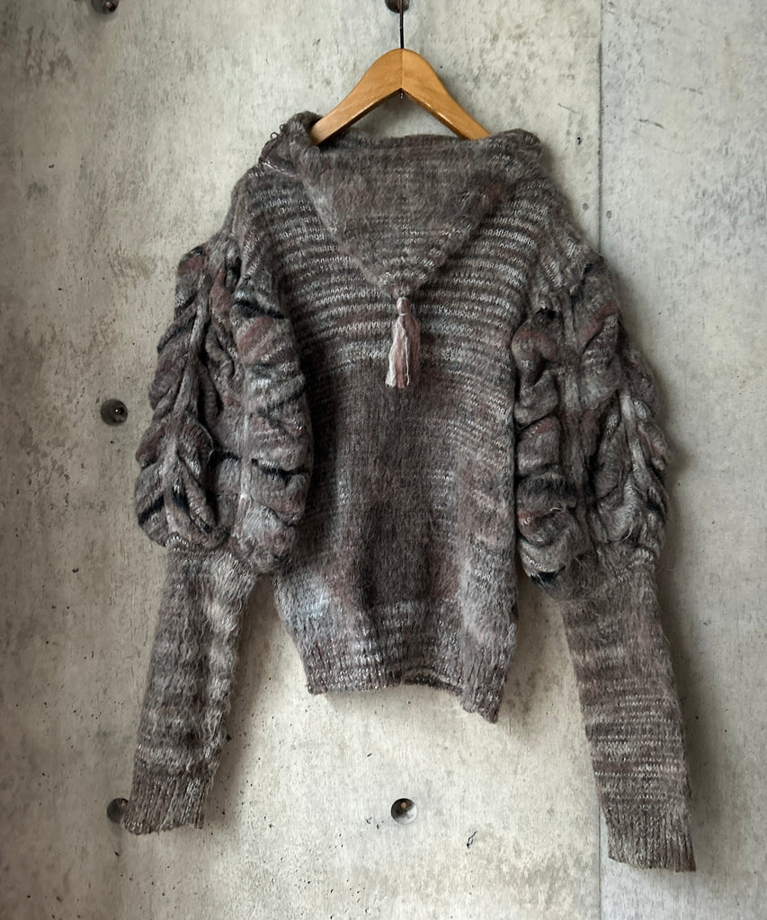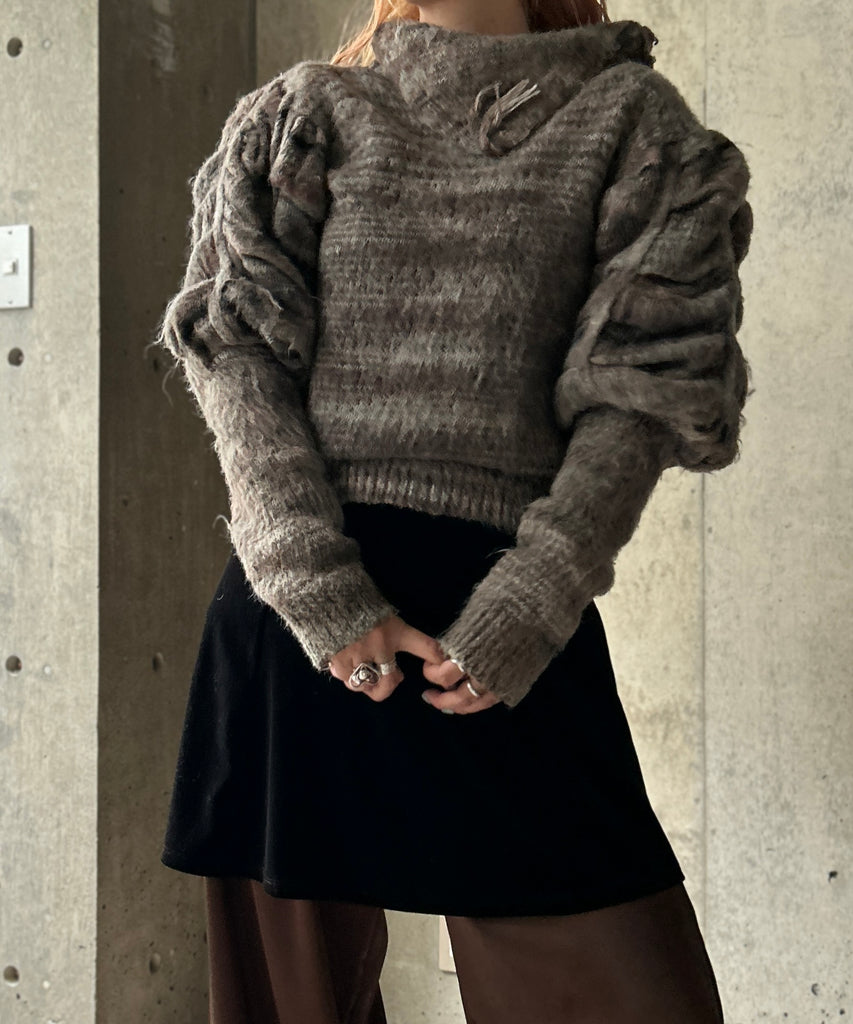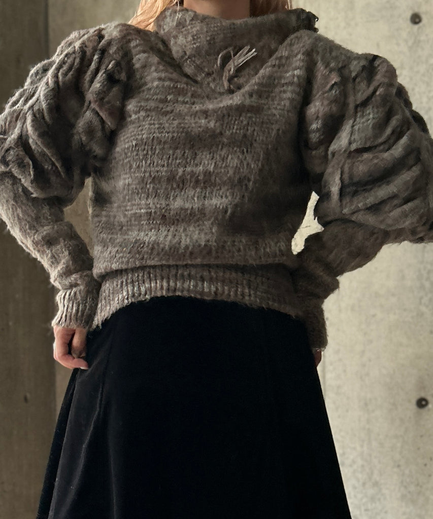 珍しいネックデザイン、袖のデザインが面白いニット。
