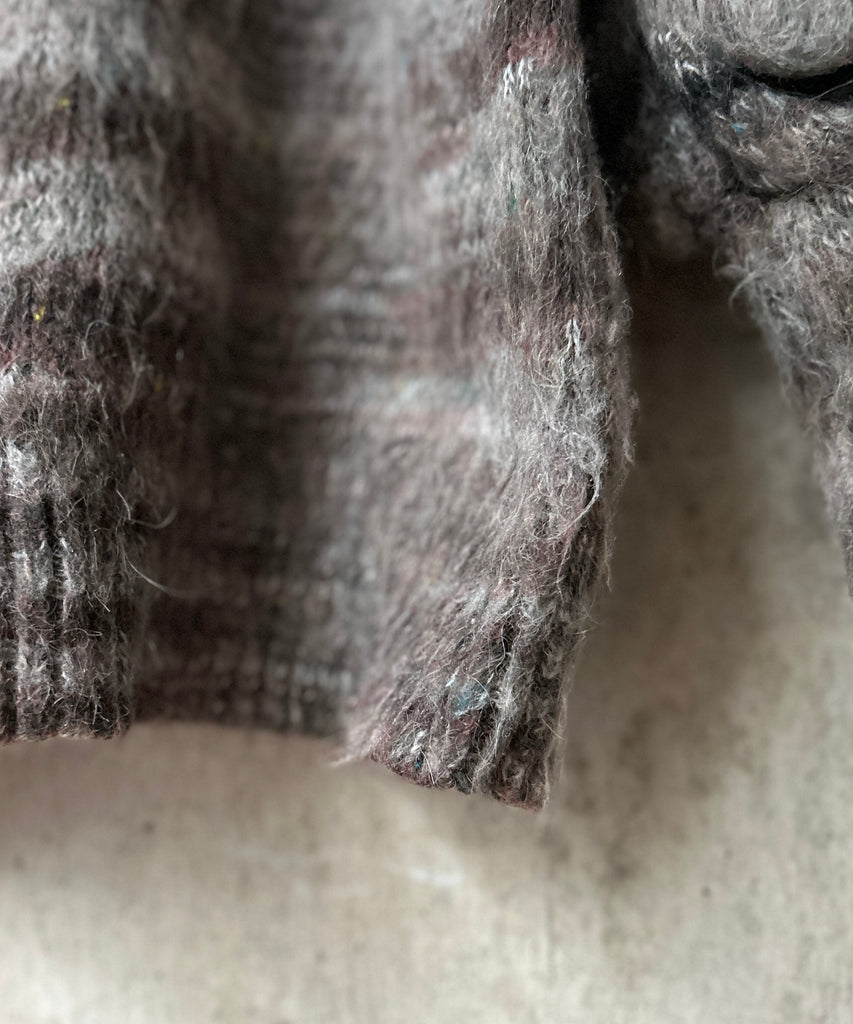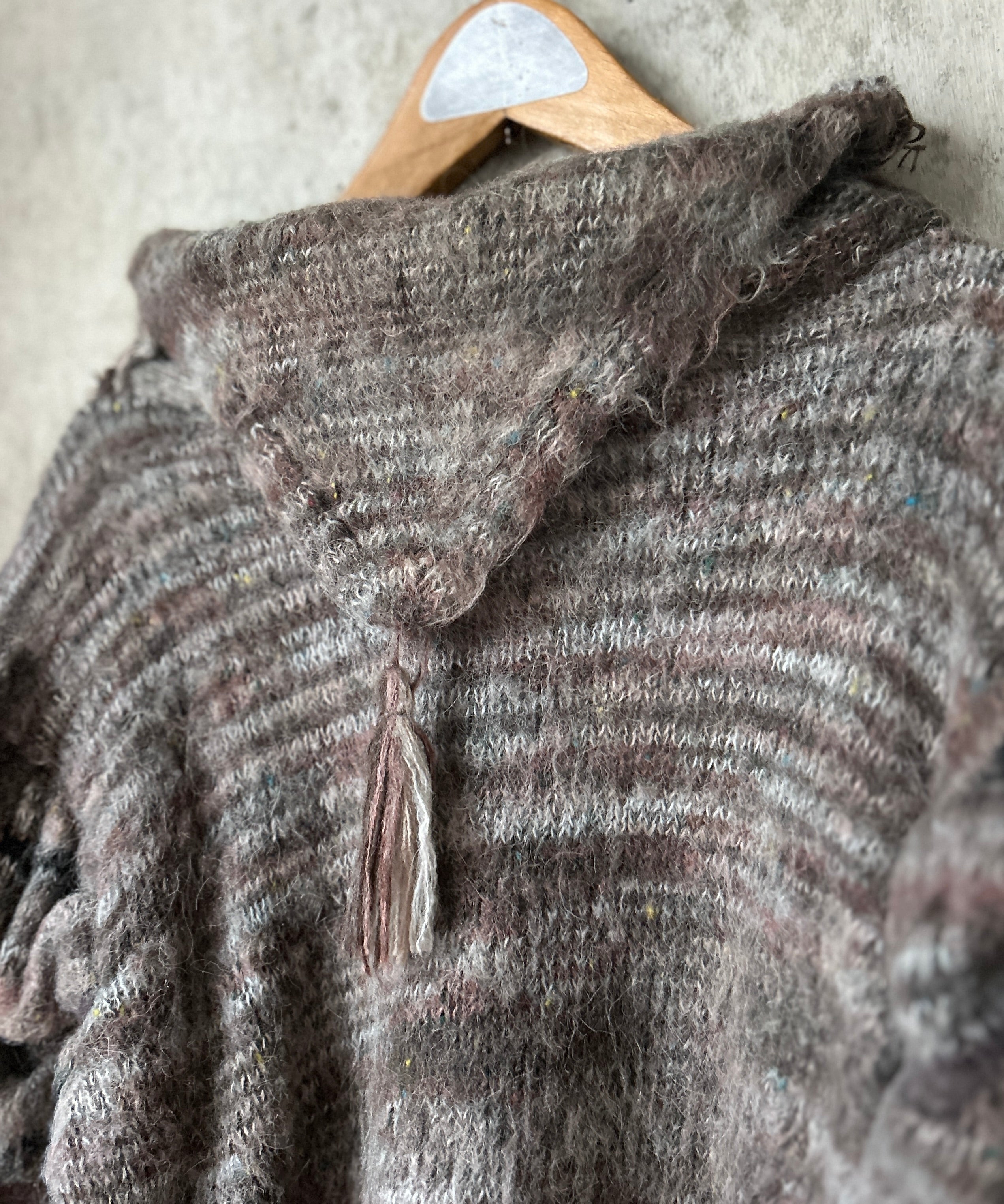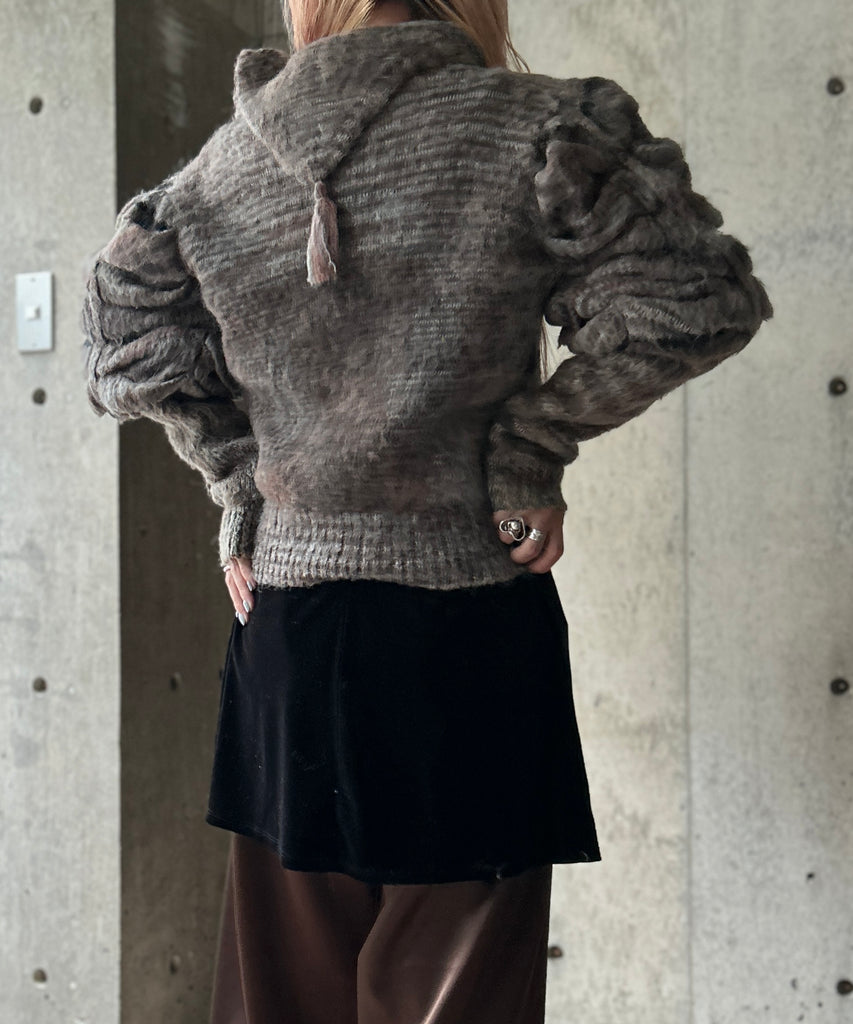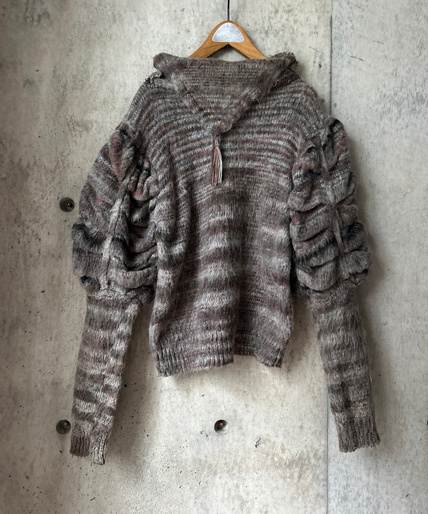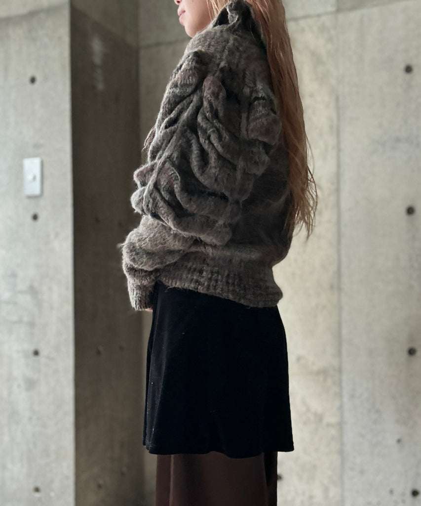 珍しいネックデザイン、袖のデザインが面白いニット。