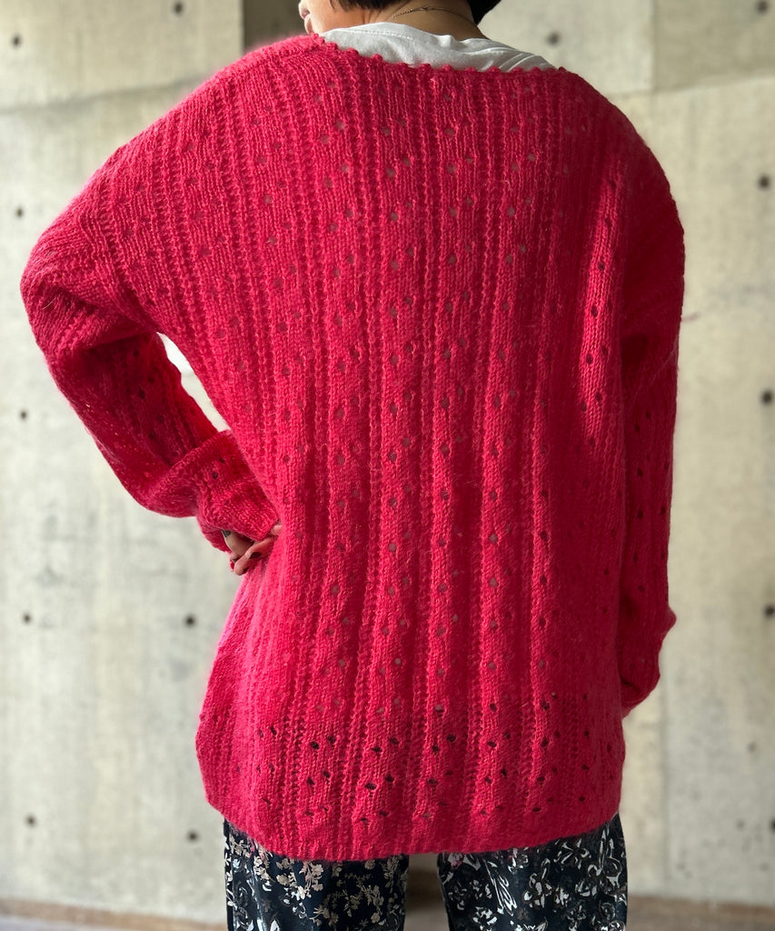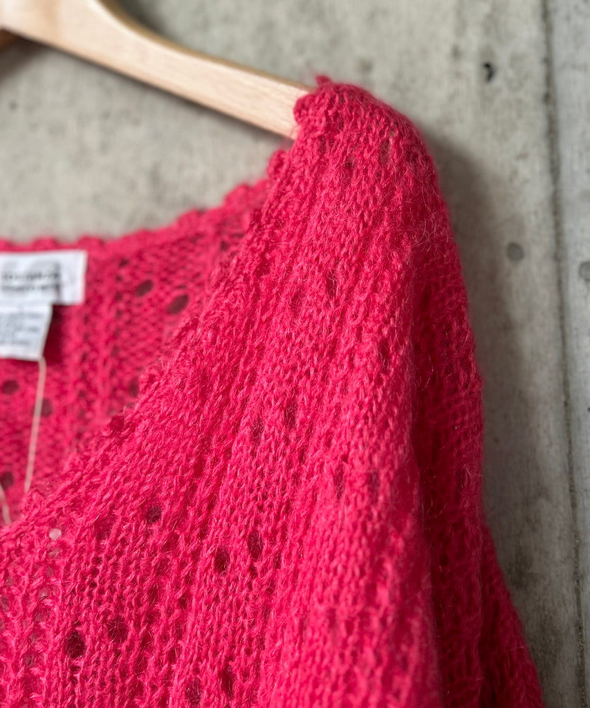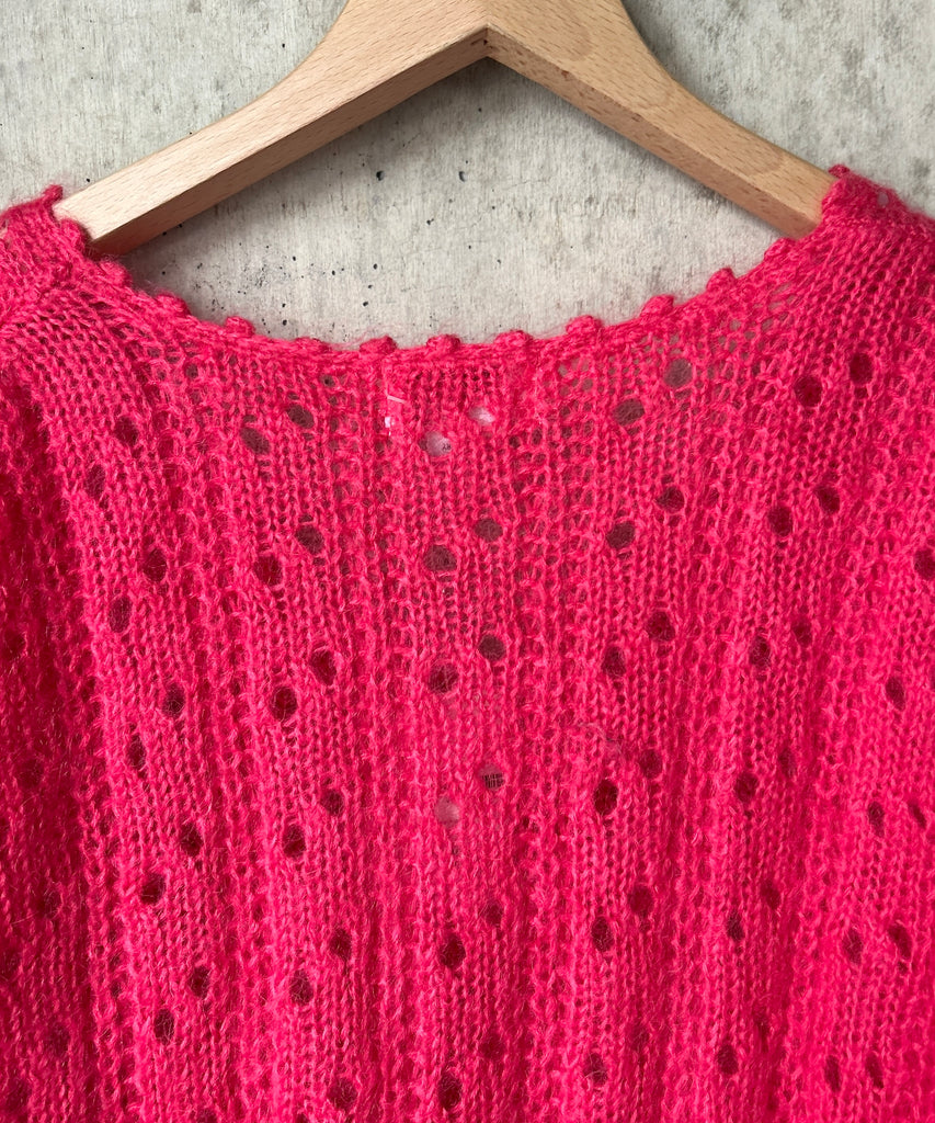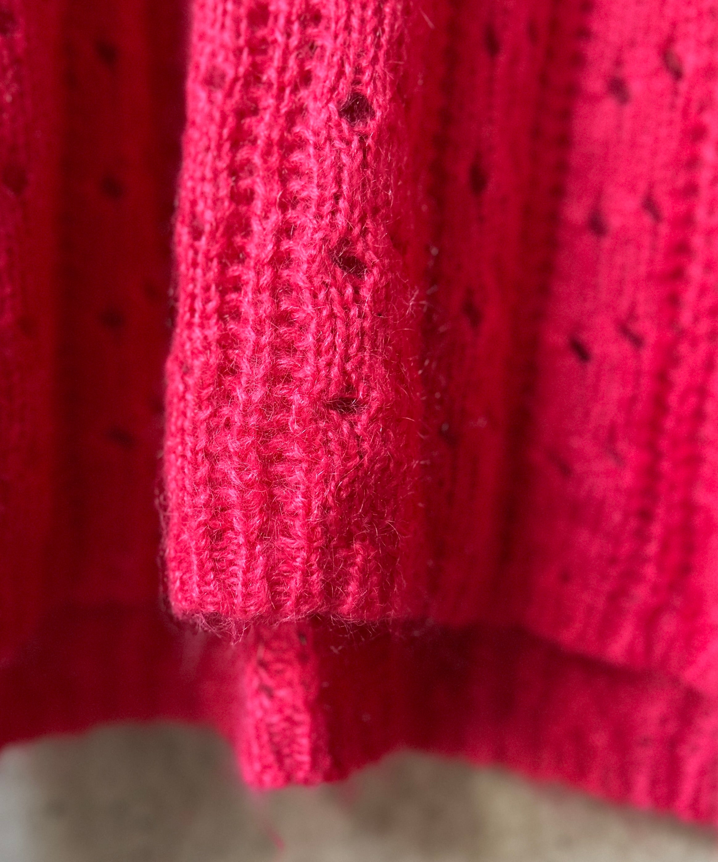 控えめな透かし編み、ネック周りの縁取りレースなど