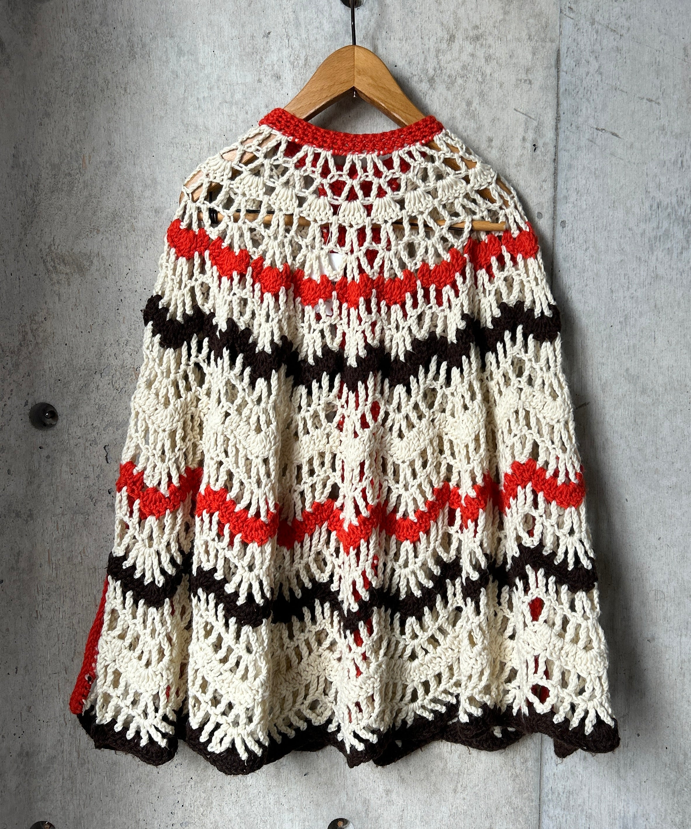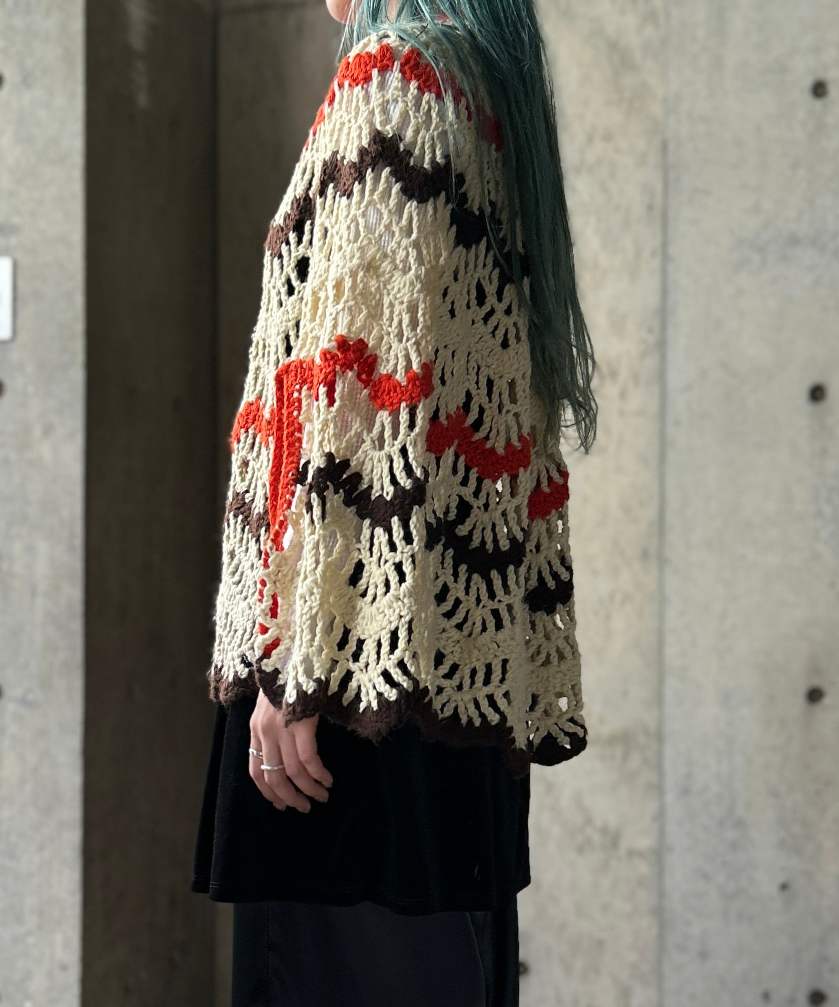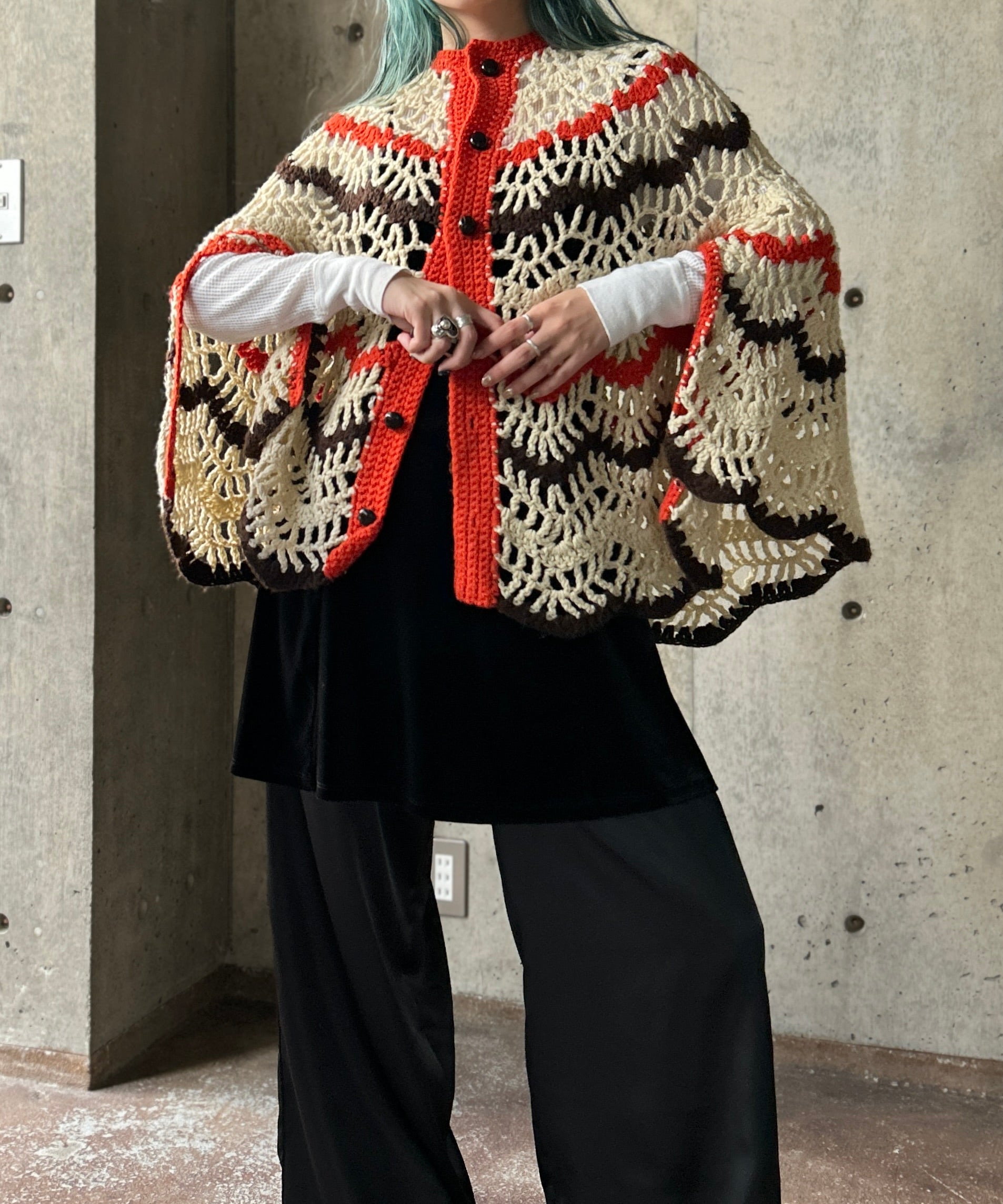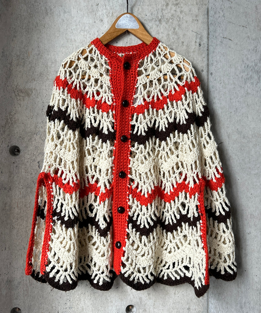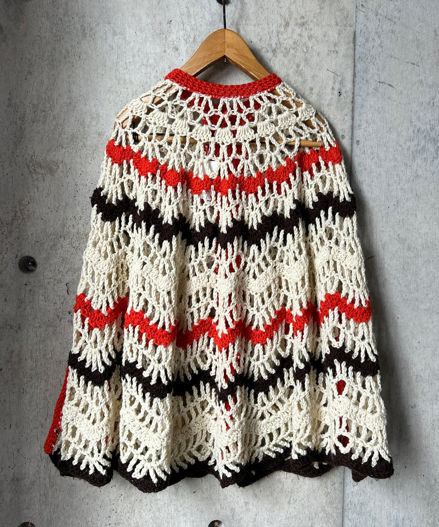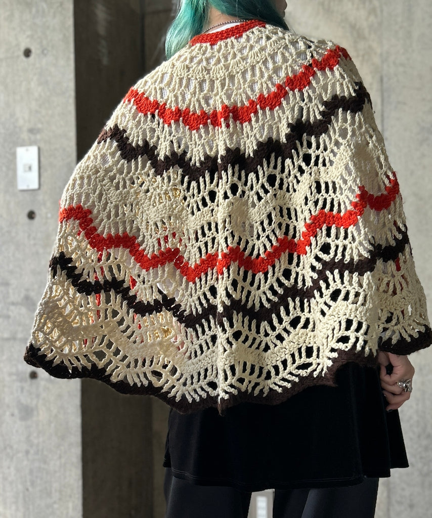 クロシェ編みのニットポンチョ。