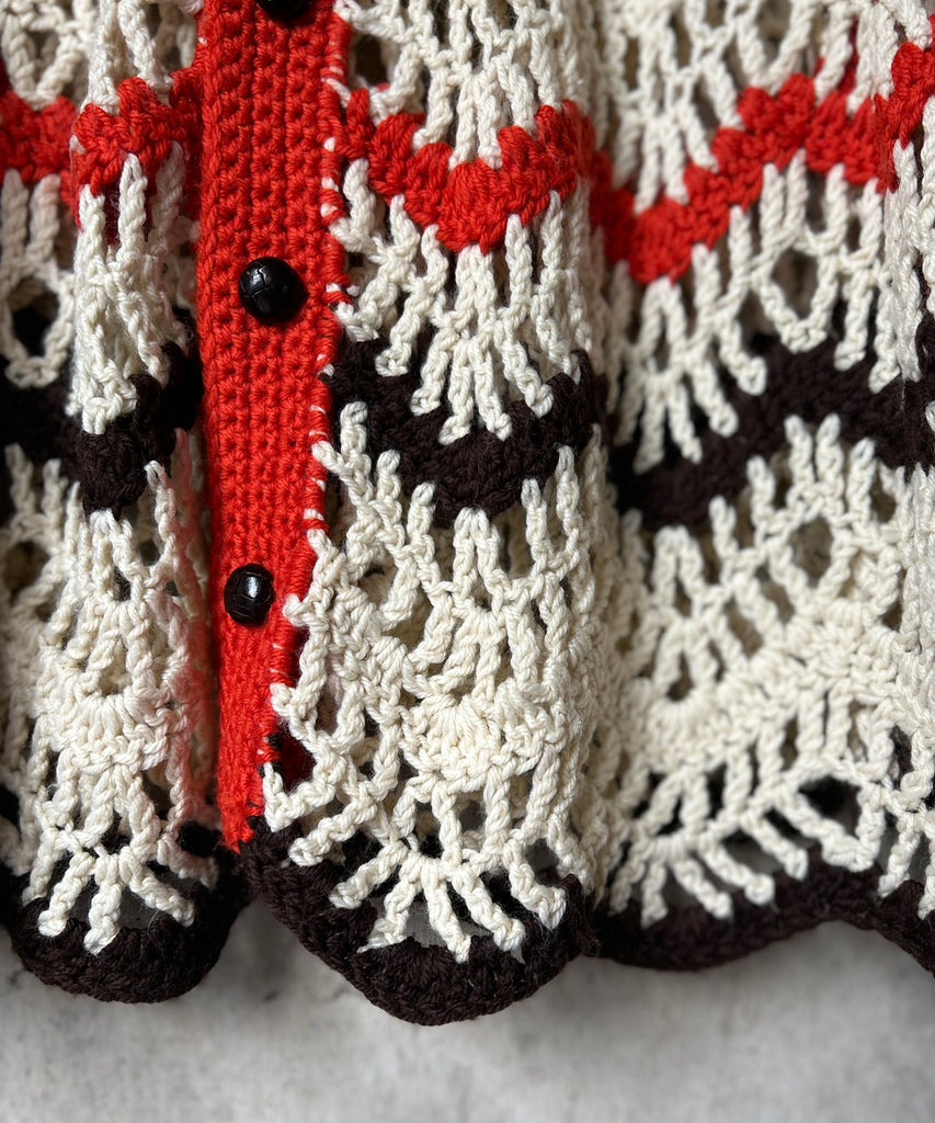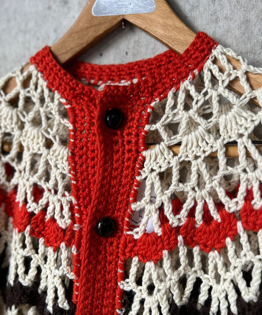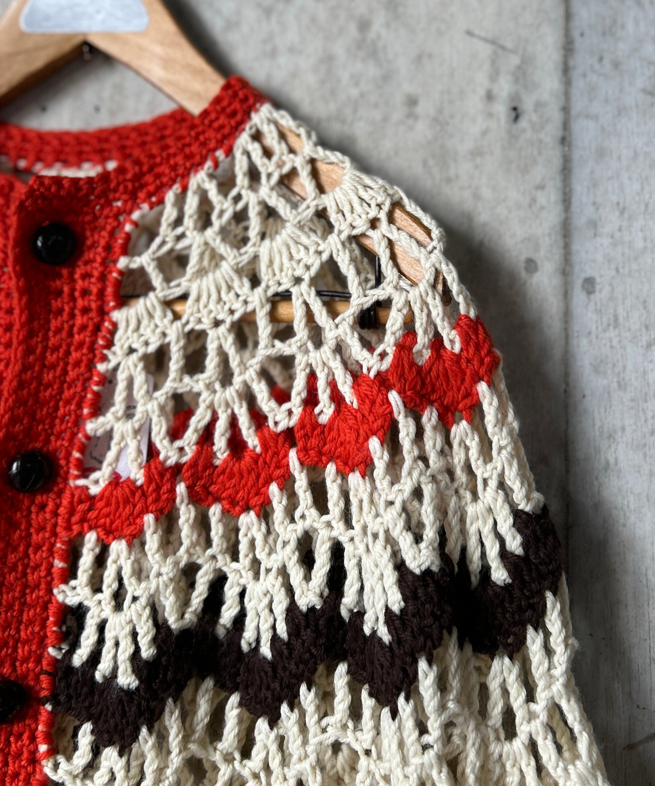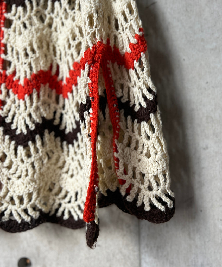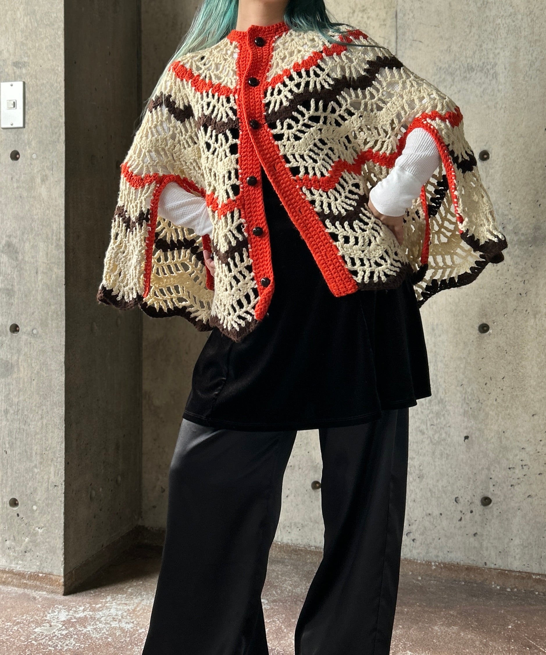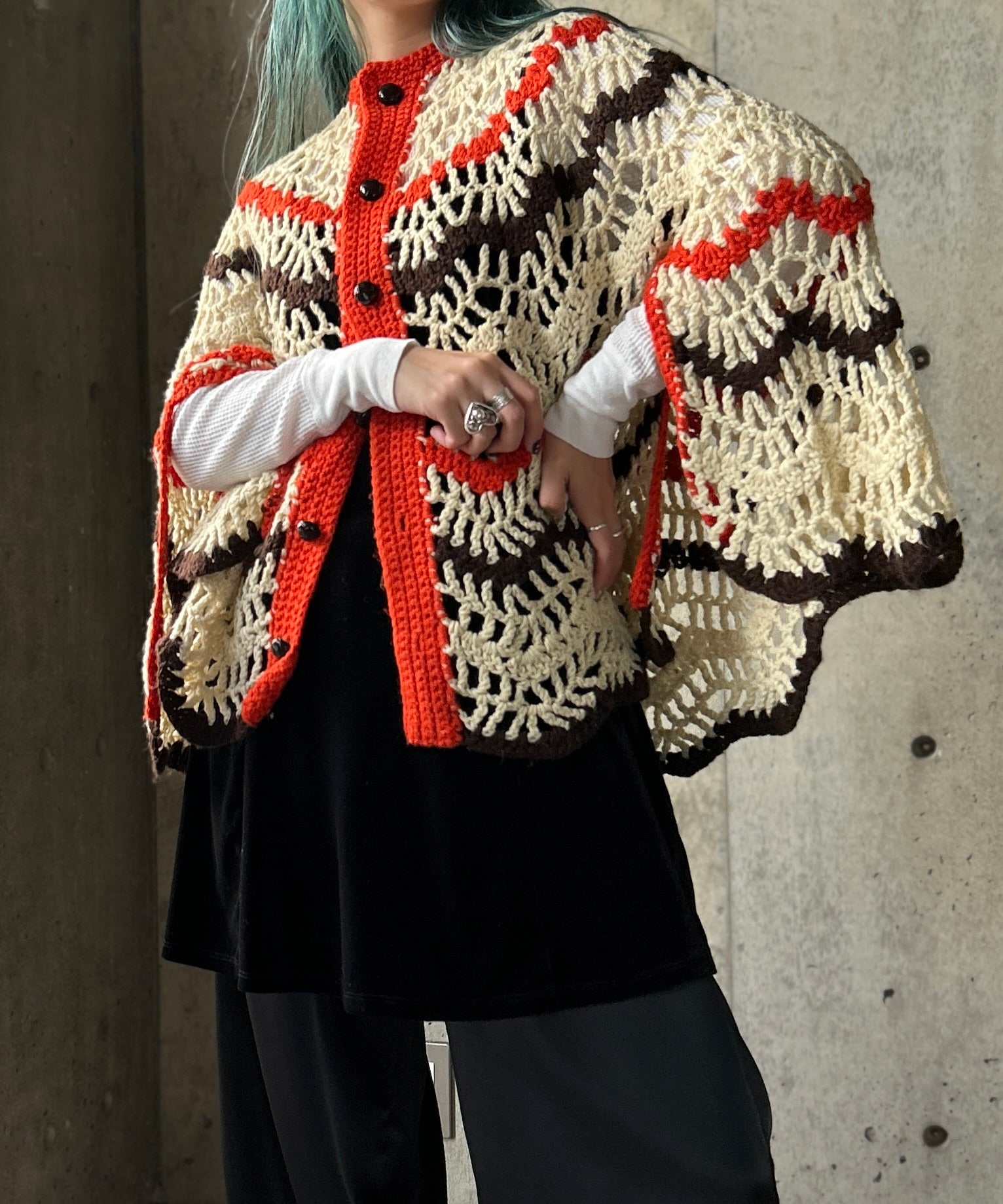 クロシェ編みのニットポンチョ。